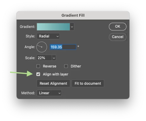 Double-click the gradient thumbnail in the layers panel and select the 'Align with layer' option.