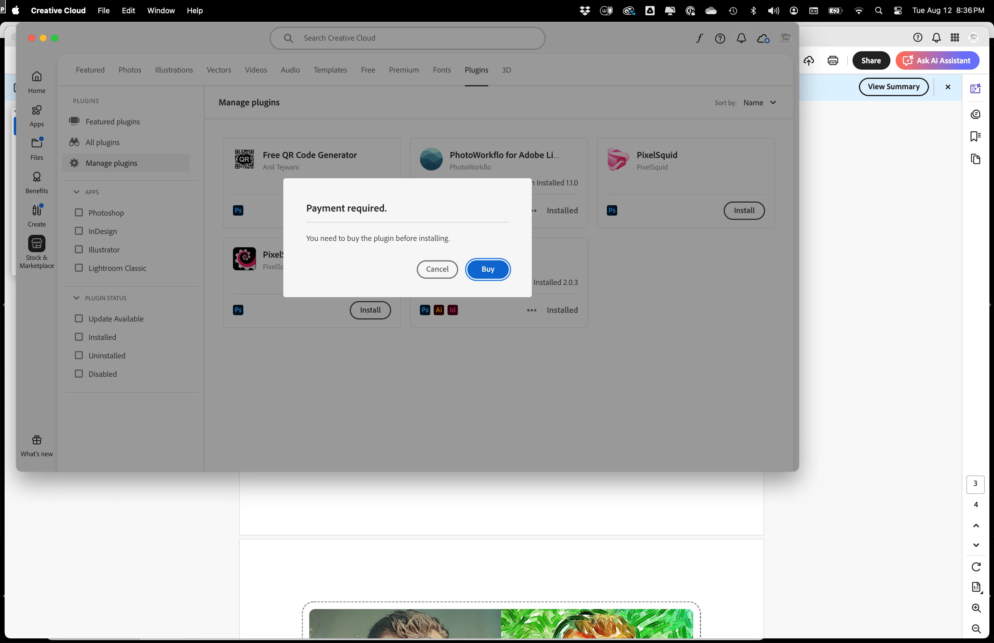 I'm working with Photoshop Creative Cloud v 26.9 on a MacBook Pro with Sequoia 15.5. I purchased a plugin from Evato for PS and downloaded it along with the License Certificate. When I follow the install instructions I get into the Creative Cloud App and get a message saying I have to purchase the plug-in.... which I'm not inclined to do BECAUSE I ALREADY PURCHASED IT!!