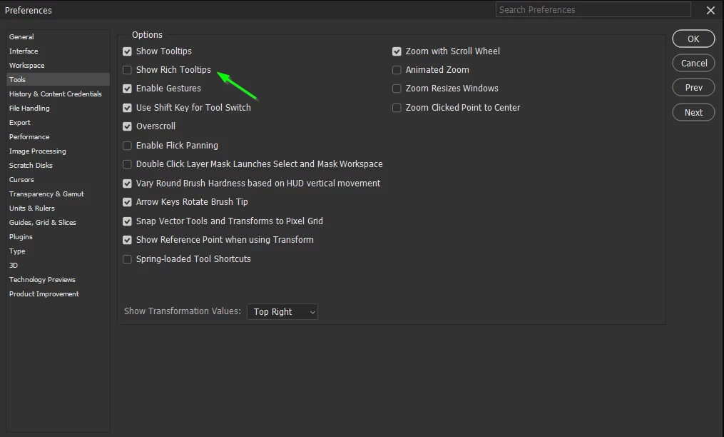 Does Photoshop 2023 have any intuitive help for beginners that show me different options when a tool is selected?