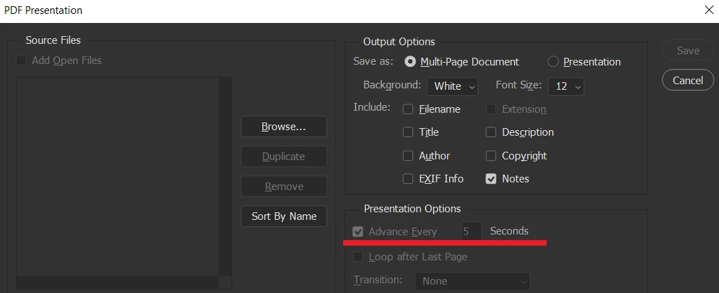 By default, PDF presentation comes with "Advance Every 5 seconds" ON even though you're on the Multi-Page Document part and it's unclickable as it is. This means if you create a PDF without turning it off when you open the PDF in fullscreen mode it will advance every 5 seconds, which causes me problems.