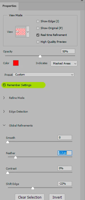 Is there anyway to save or remember my Global refinement settings in "Select and Mask"?