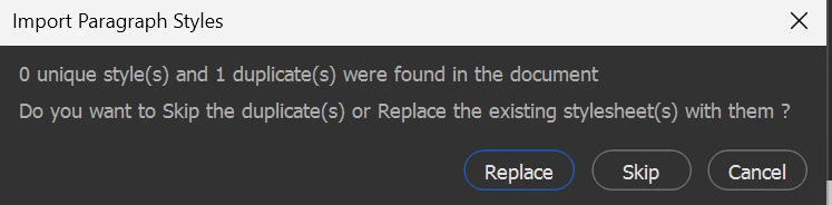 Is there any way to skip those thing? Like, when I change the font, I surely want to replace it by the action I created so I don't want to click Replace with each text layer anymore. Or while Import Character styles it's clearly that I wanna replace the existing one - the default set name None of every file. I don't know why those alerts need to pop-up, some of my actions being useless while the action keeps stopping to made me click and click just to make it continue.