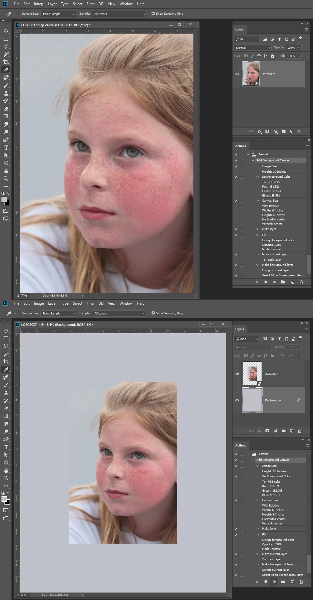 Here is where I get stuck. I want to fill the transparent canvas with the same color as the background but if I use the eye dropper tool it will do that one color. For example if one picture has a black background and I use that one to create my actions. When batch processing it will use the black color on the other files even if they have a blue background.