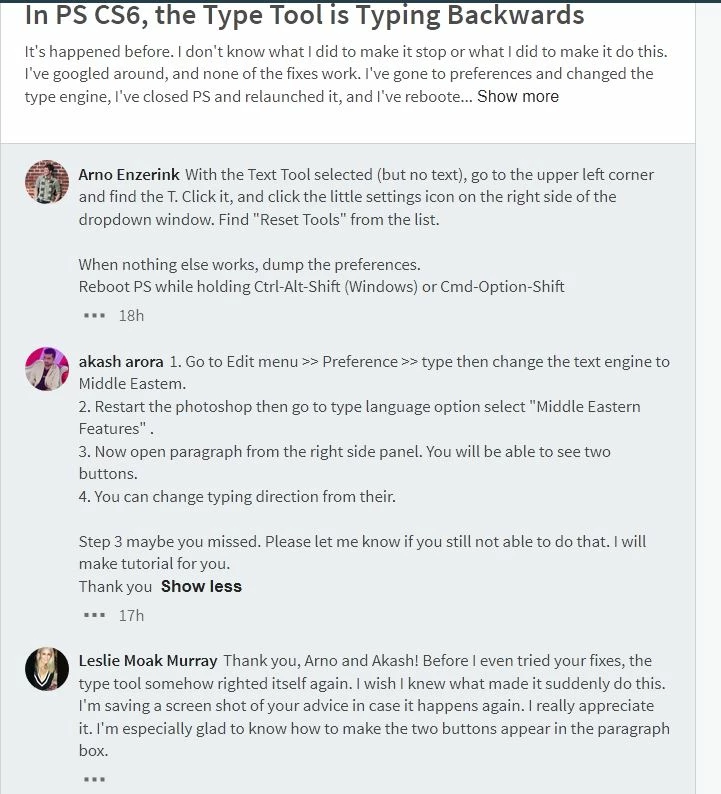 If the type tool is typing backwards, and I think that's what you're saying, this has happened to me. I asked for help in the LinkedIn Photoshop group, and here is a screenshot I took of the fixes - this was a couple of years back (before I had found this wonderful Adobe forum!), and it was CS6, but maybe it can help with your problem: