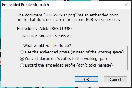 I choose to keep layers because as I said, I need to edit them. I noticed when I finished the editing that the colors were a bit different from the original file, which I have saved as a PNG, so I thought the problem might be the embedded color profile, so I opened the PNG file and got the following: