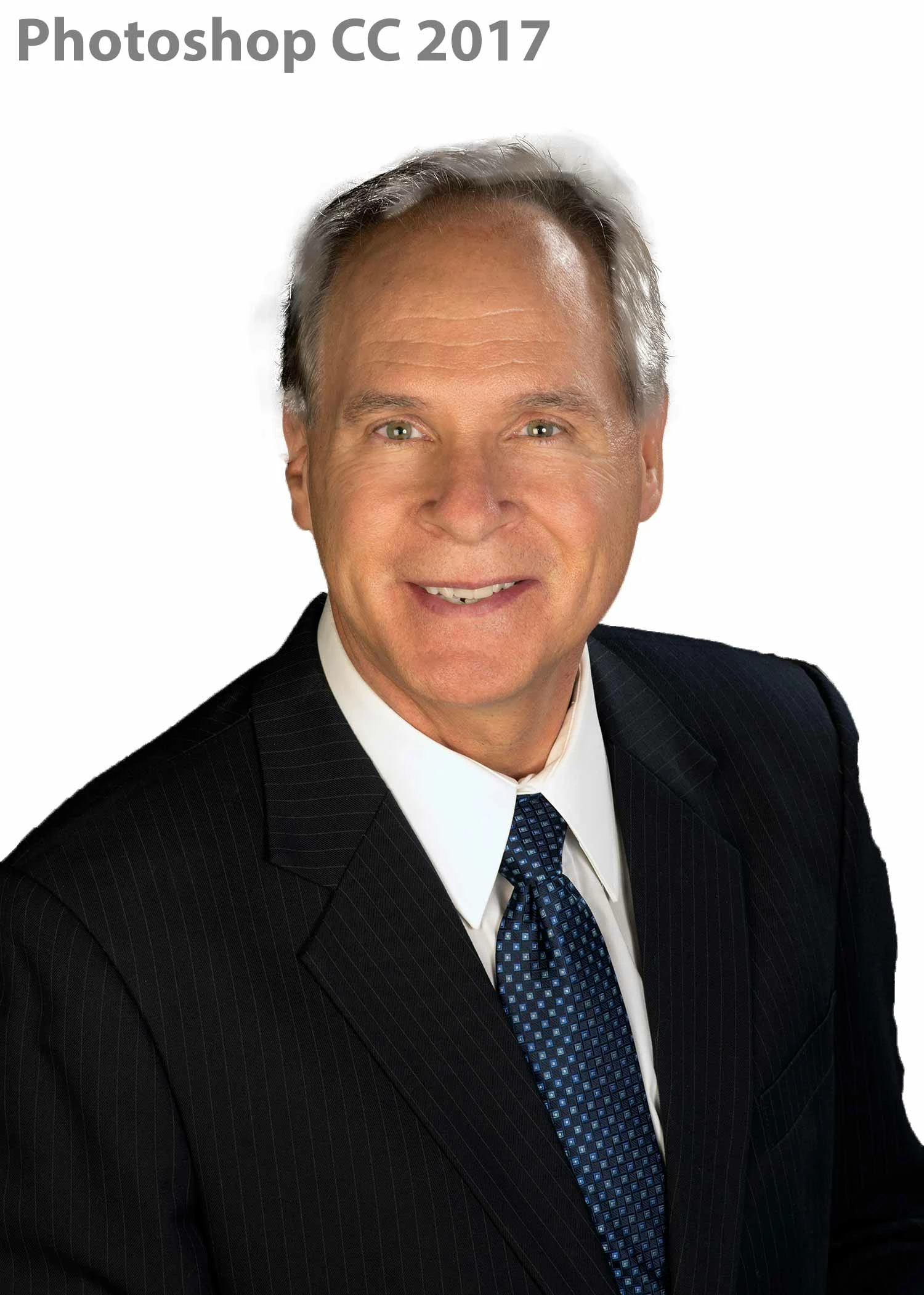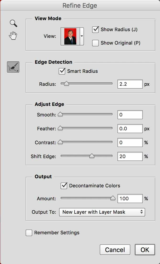 I am having similar issues with Photoshop CC 2014 and CC 2017. This means the old and new versions of the refine edge tool are not working as they should. I start the selection of the person using the quick selection tool, then move into the "select and mask" panel to fine tune the selection and deal with the hair. Once I have completed the fine tuning, I apply the changes and have the selected cutout created on a new layer with a layer mask. I have attached images showing the original and the result of the refine edge selection in CC 2014 and 2017. As you can see in the profile cutouts with the white background, 'smudges' are shown on the actual images. These are being carried over from the refine edge tool. I am not sure why this is happening. I have followed various tutorials on YouTube and an official video from Russell Brown of Adobe. The tool works great on all of the sample images used by the presenters, but this image seems to fail. Would the dark background, dark hair and suit be a factor?