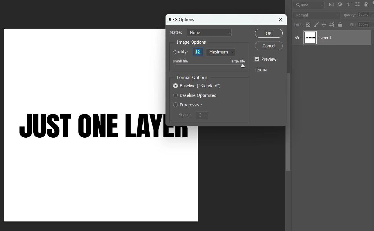 Most of the files exhibit this same behavior; they're saving at sizes upwards of 130 MB. To investigate the issue, I began by removing layers, but I found that even when reduced to a blank canvas, the file size remains around 130 MB.