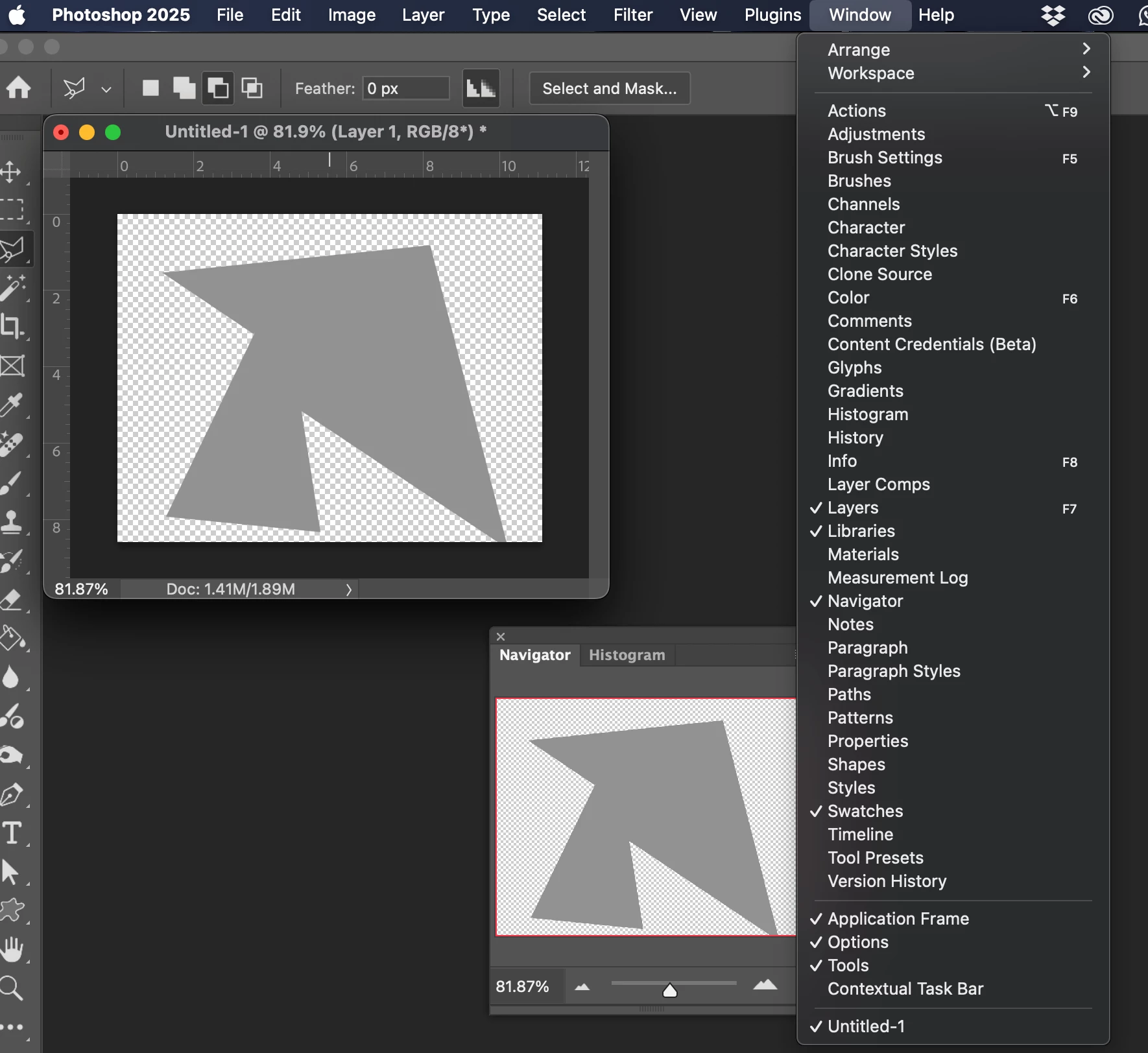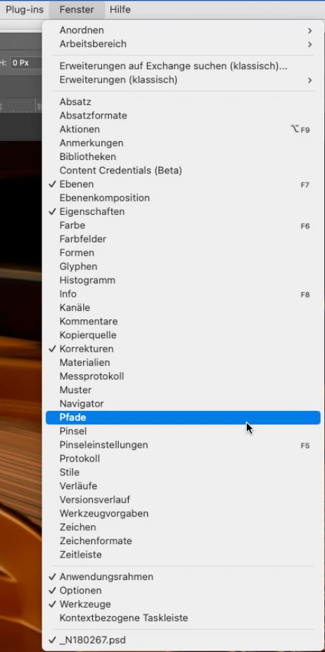Menu ‚Fenster‘ (Windows?) did not mark the command ‚Pfade‘ (‚Path‘ ) and did not show a Bedienfeld.