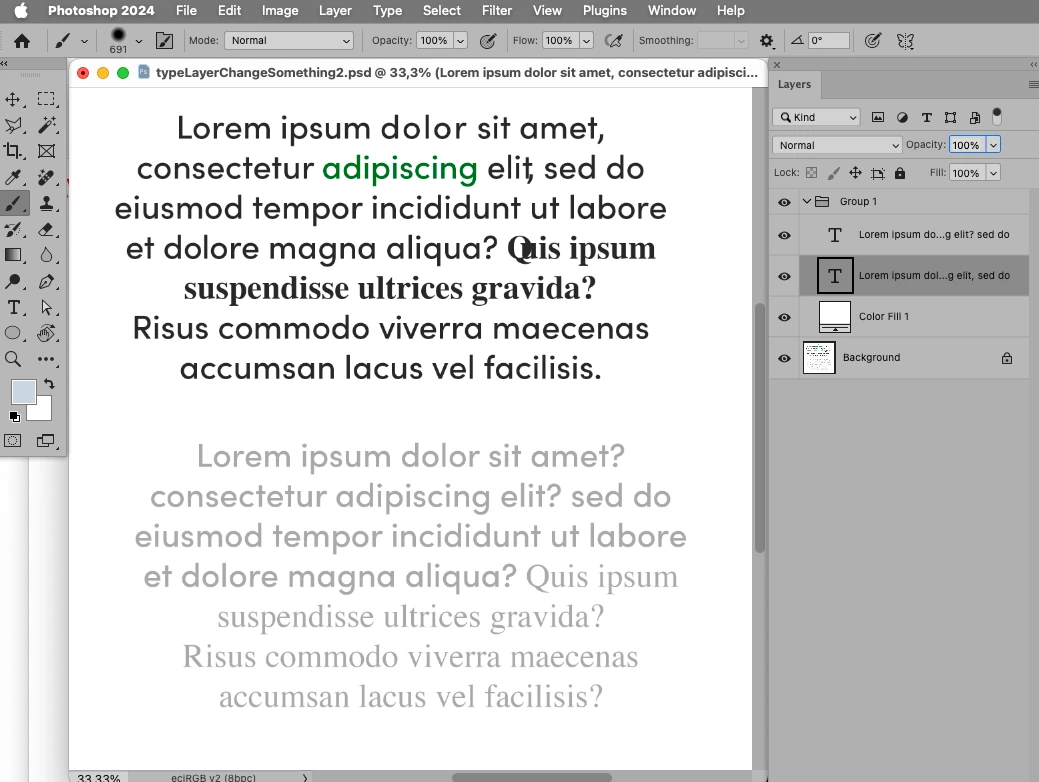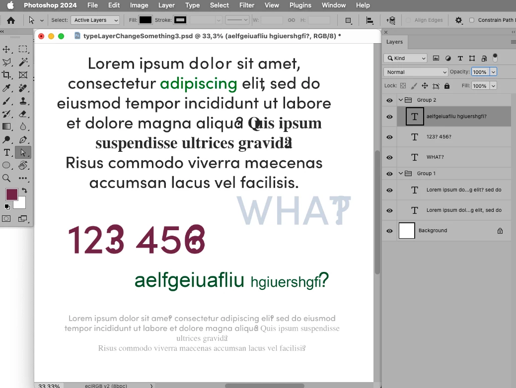 // apply properties like fonts, size, … to letters of words in selected type layer;