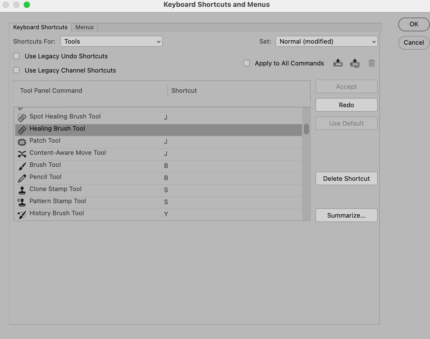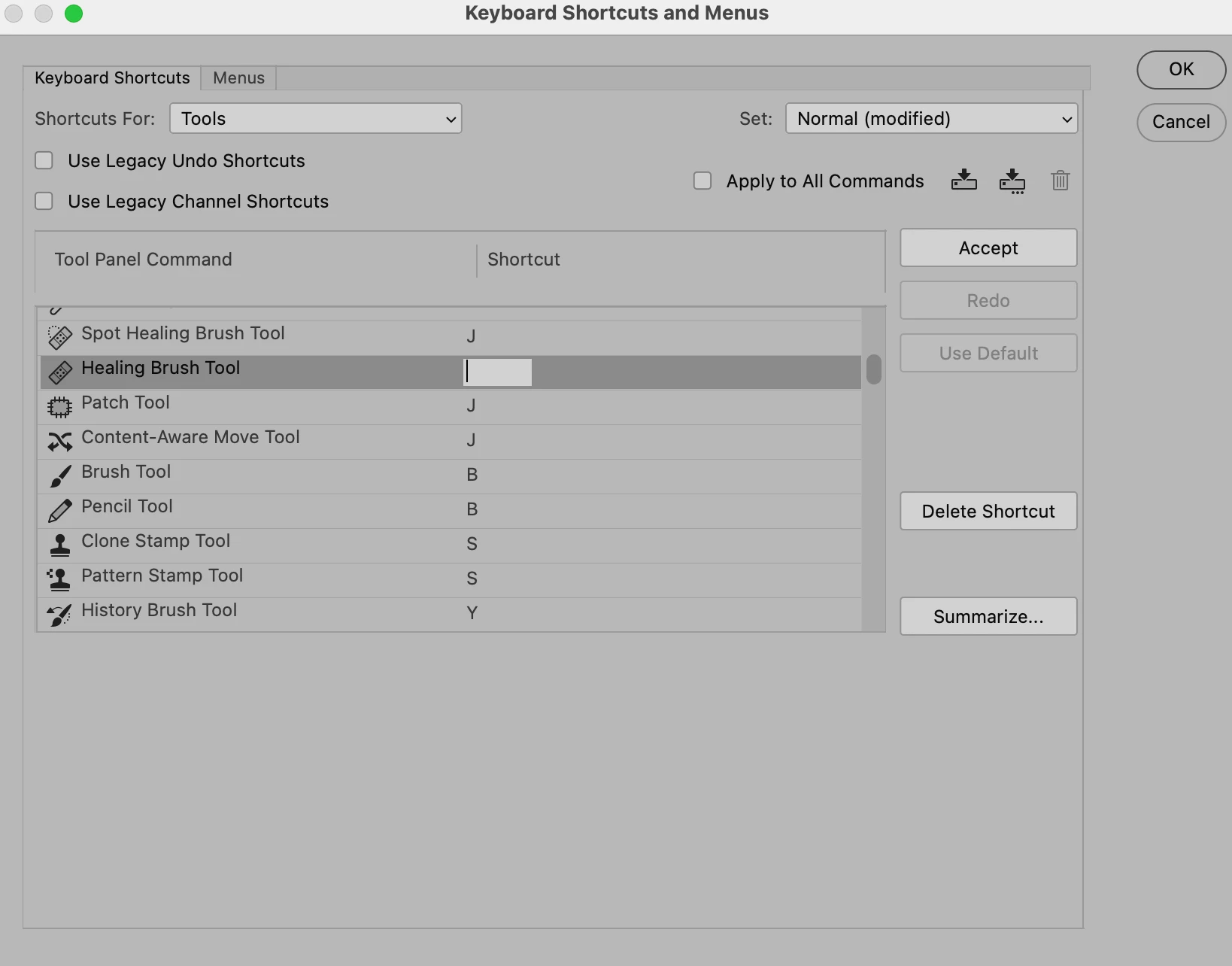 I used the 'q' key to invoke the Healing Brush tool for example. When I try to change 'J' to 'q' the window changes as per the two screen shots.