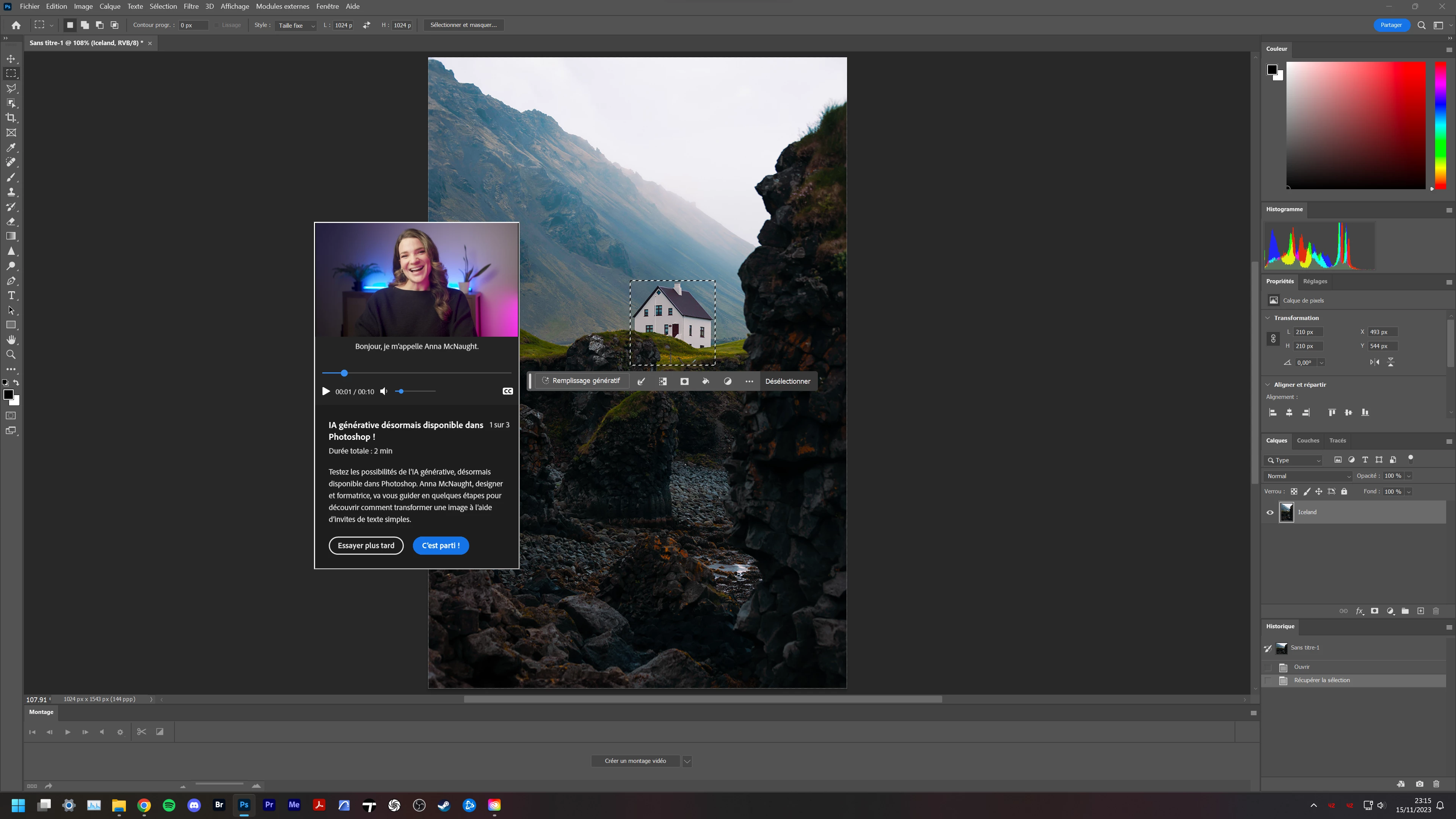 Bonjour, à chaque fois que je lance photoshop, le tutoriel intégré sur l'IA générative se lance (voir screenshot). J'ai beau le suivre en entier ou cliquer sur "essayer plus tard", le tutorial réaparait à chaque lancement de photoshop. C'est relativement pénible le fichier d'exemple du tutoriel ainsi que la vidéo d'acompagnement s'ouvre systématiquement à chaque démarage, même si je choisis d'ouvrir directement un fichier PSD, DNG ou autre, je dois d'abord fermer la fenêtre du tutoriel avant de pouvoir commencer à travailler sur mes fichiers...