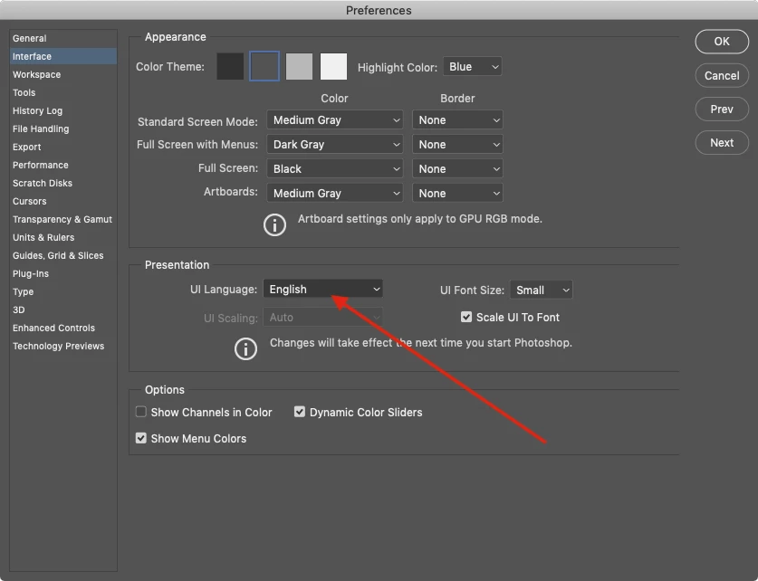 Change the language used in the Photoshop preferences and restart.