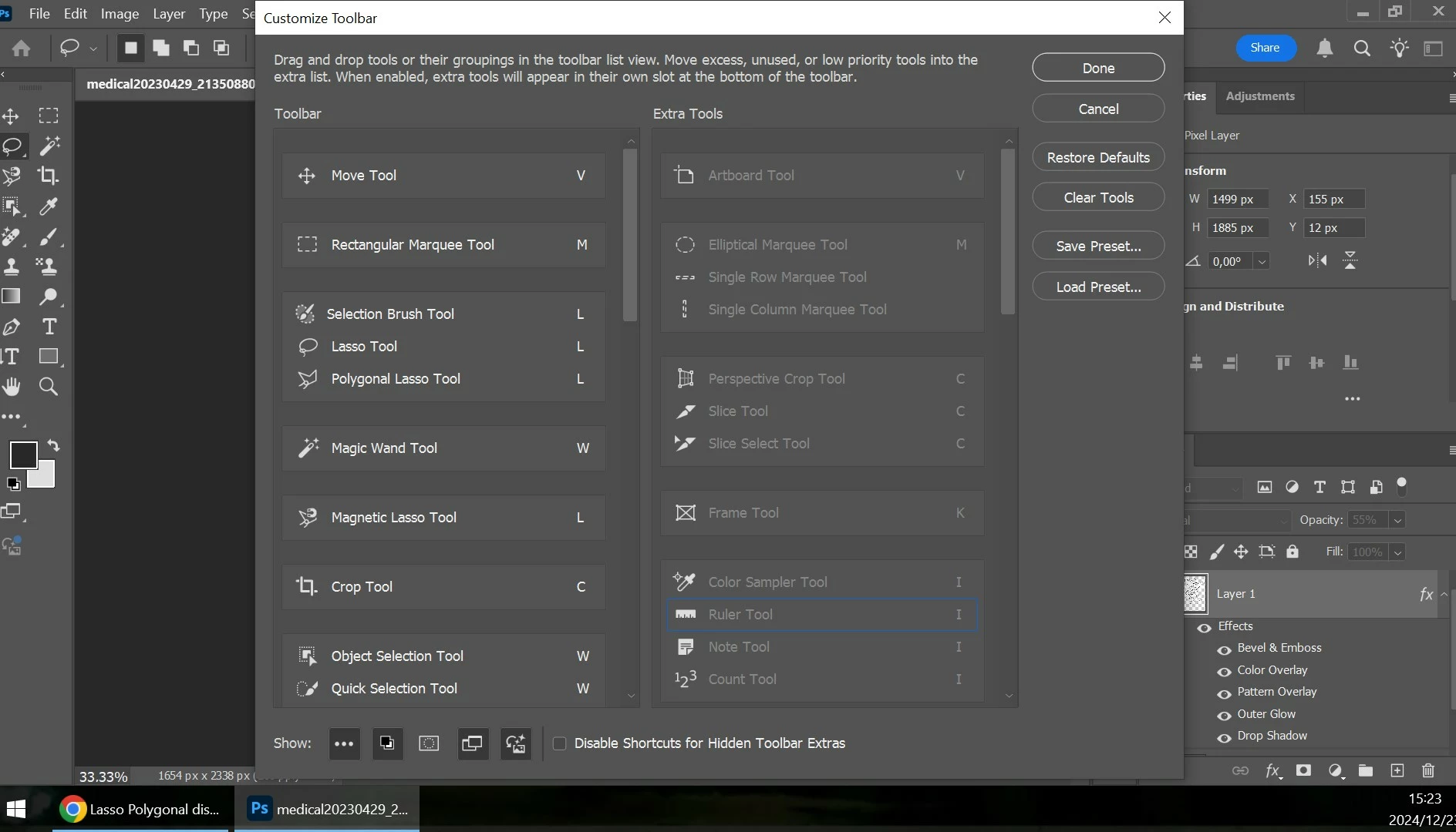 Pour des raisons de materiel je suis en clavier QWERTY je suis sous un windows 10 d'afrique du Sud avec la langue "english" J'ai donc photoshop en Anglais ... Apres une mauvaise manip du control C control V j'ai perdu le dock des instruments sur Photoshop j'ai retrouve comment recuperer le dock mais apres ca je ne trouve pas le lasso polygonal comme a son habitude a sa place et il me manque baguette magique
