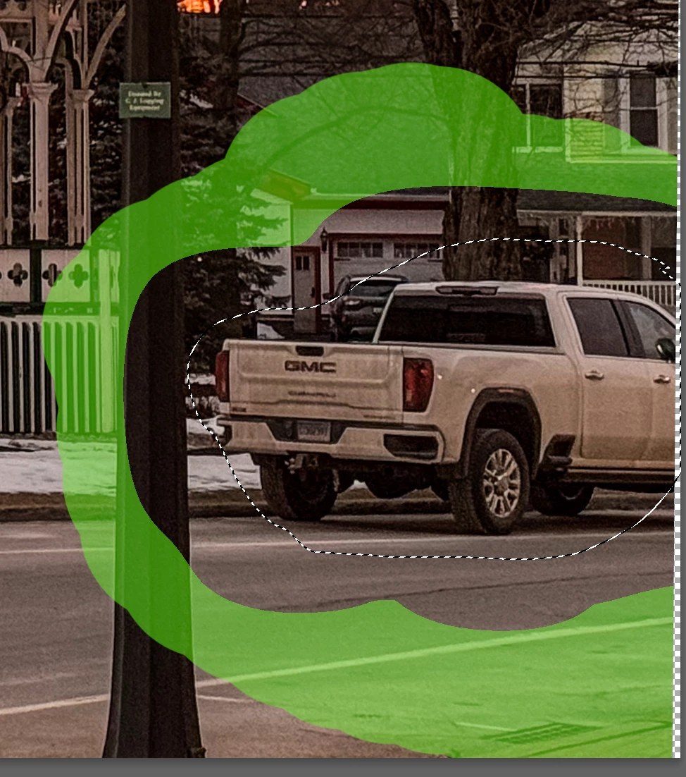 My intention was to remove the truck from the image. I had tried other methods (Removal tool & Generative Fill), but wanted to see how Content Aware Fill would work. After selecting the truck, I went to Edit> Content Aware Fill and found that PS had selected a wide area of the image so I erased that and used the brush to select the areas to use. However, it would not add the area around the selected truck. It seemed to stay a specific distance frm the selection edge, like a large halo.