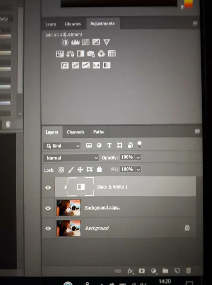 So, you must have been clicking around kind of a lot there. At this point in the tutorial, you should only have the background layer and a B&W adjustment layer above it. So, you can try...