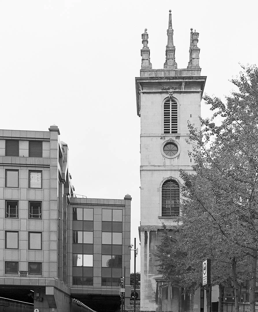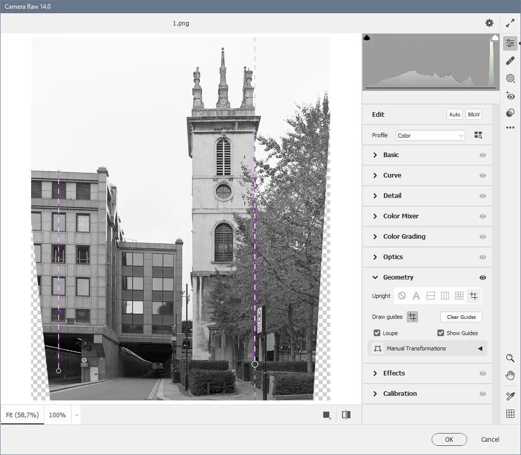I have an architectural image where the subject splits into two halves. The church on the right is correctly positioned and I don't want to pull at anything or I could lose the top part of the tower. But the buildings on the left have a distinct tilt and I want to correct that.