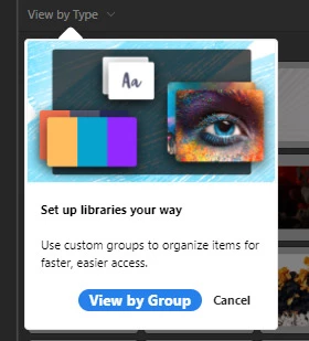 Aftern new launch of photoshop, in the Librarie panel there is ALWAYS opened popup, nagging to view by Group,