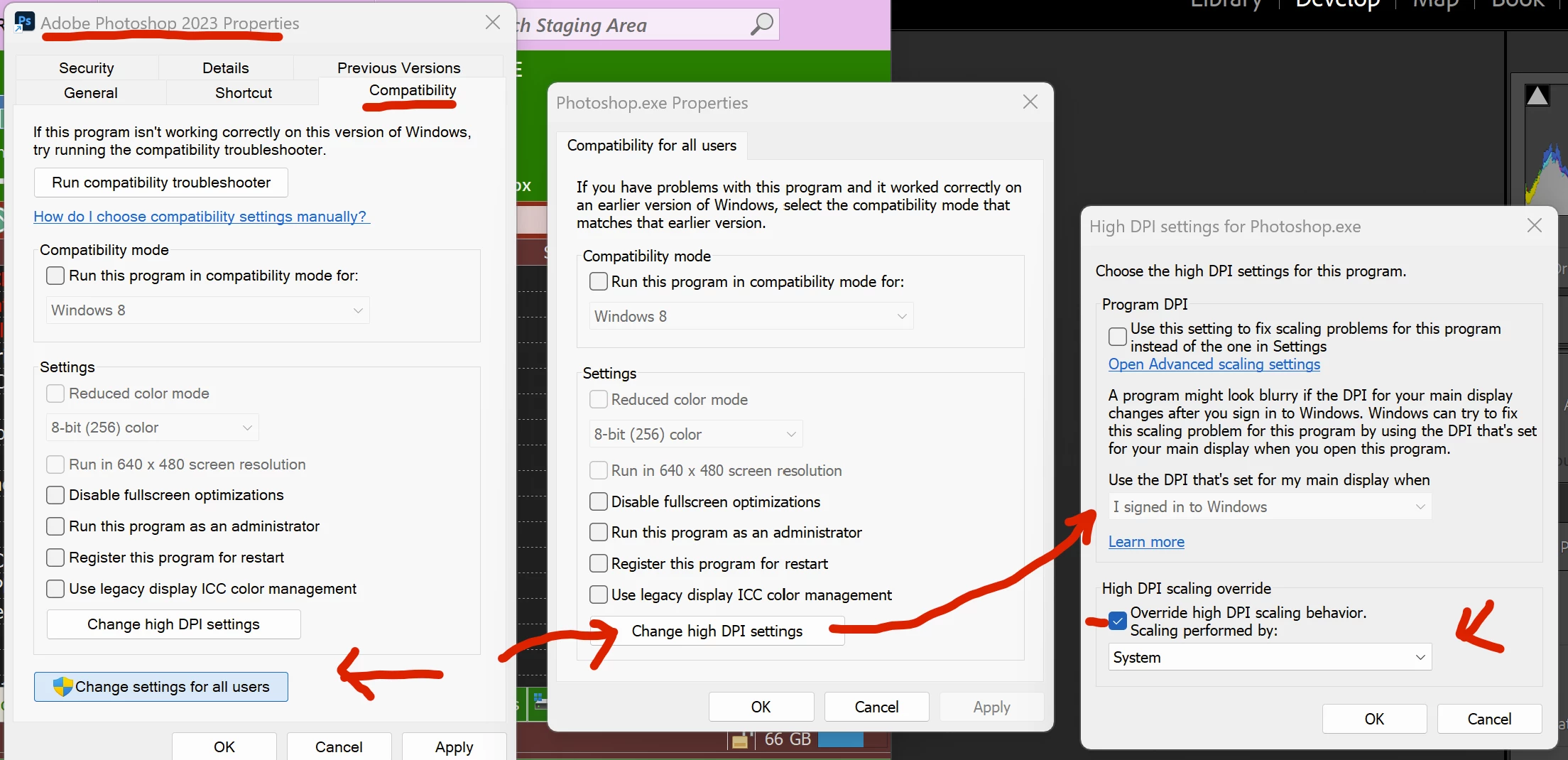 Lighroom does not seem to be launching photoshop the same way that it launches when custom DPI scaling is being used for the application on the compatibity tab of the icon's propeties.