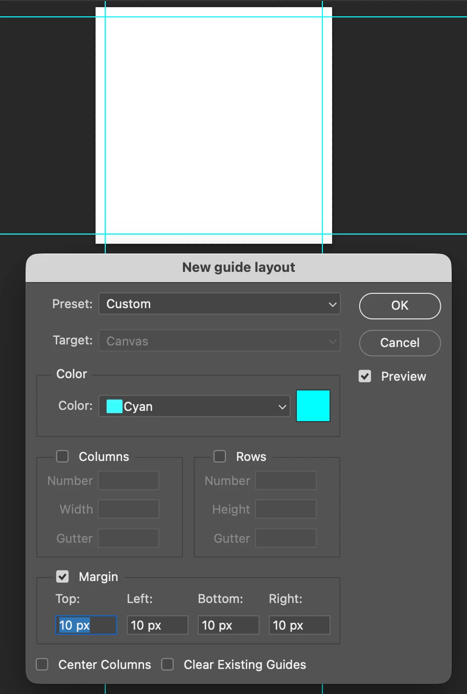 Create a square block 24x24px to use as a means of setting guides on each side of the canvas.