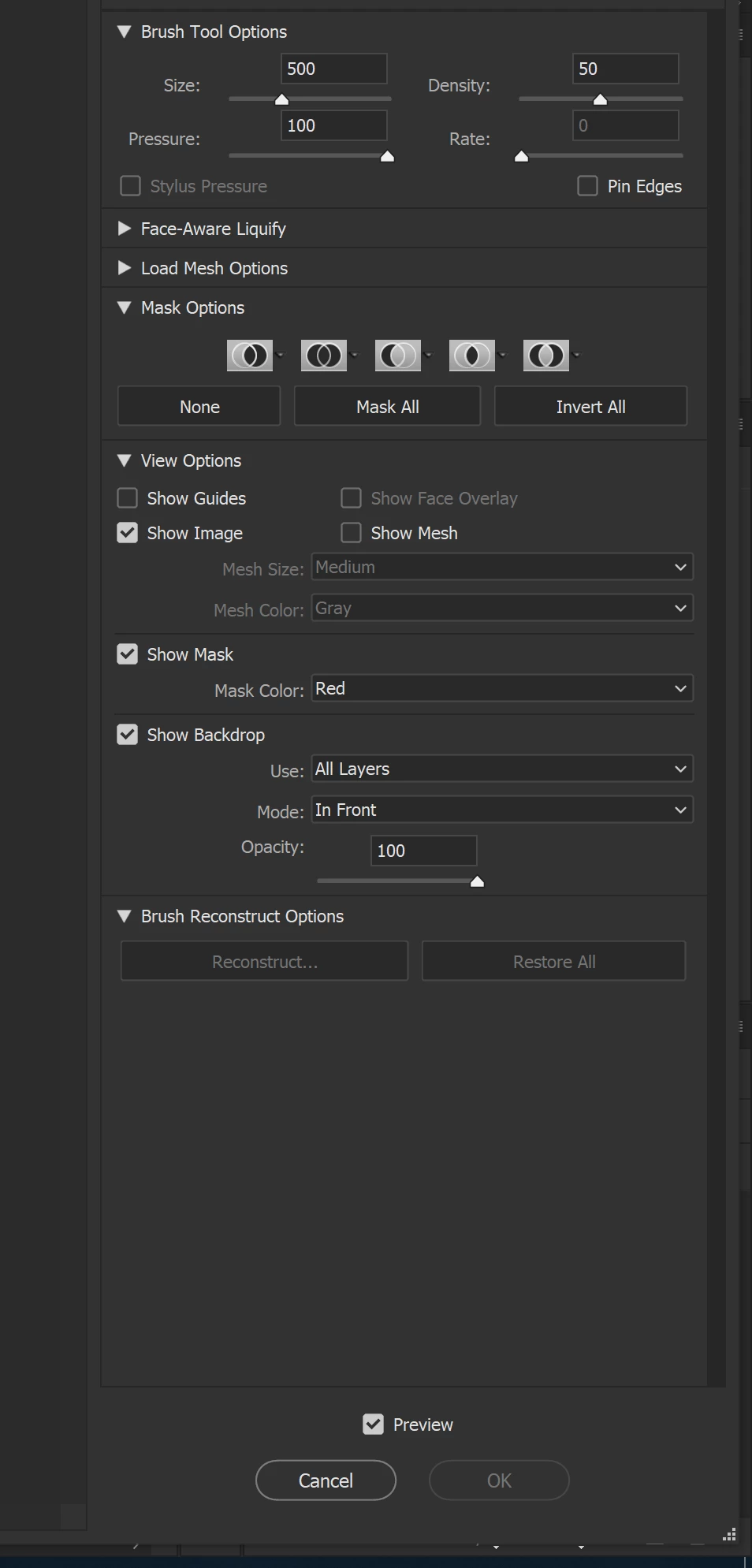 I might, just possibly, be a display issue related to your video card driver, but I think Liquify uses the GPU, so you can turn off GPU acceleration to test it. So my gut tells me this is going to come down to resetting preferences. Your best bet is to do this manually.