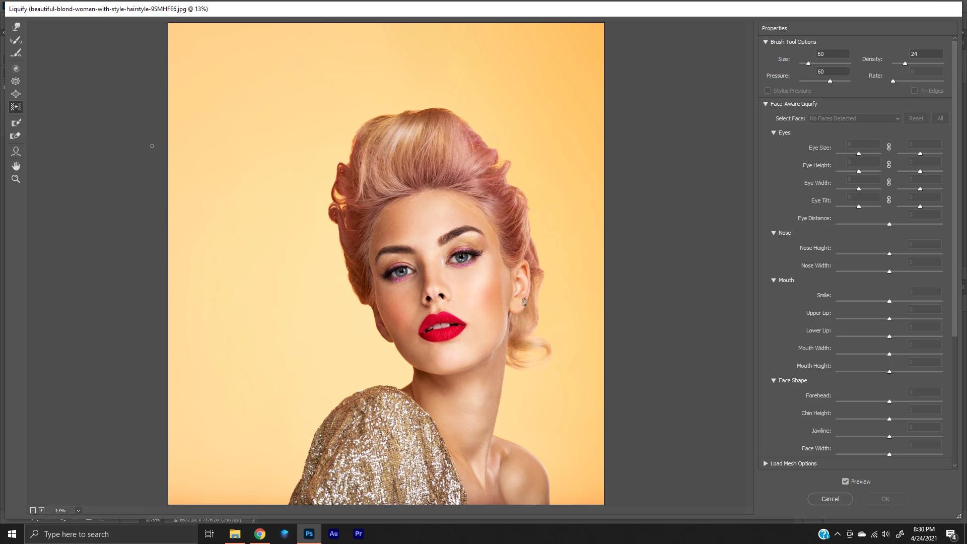 The picture is a simple portrait. Right side up with the full face of the model visible. Liquify has detected more confusing faces than this, so any ideas on how I can get it to recognize this one?