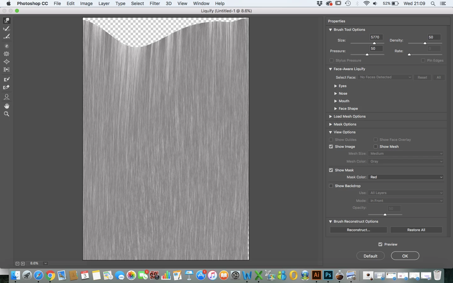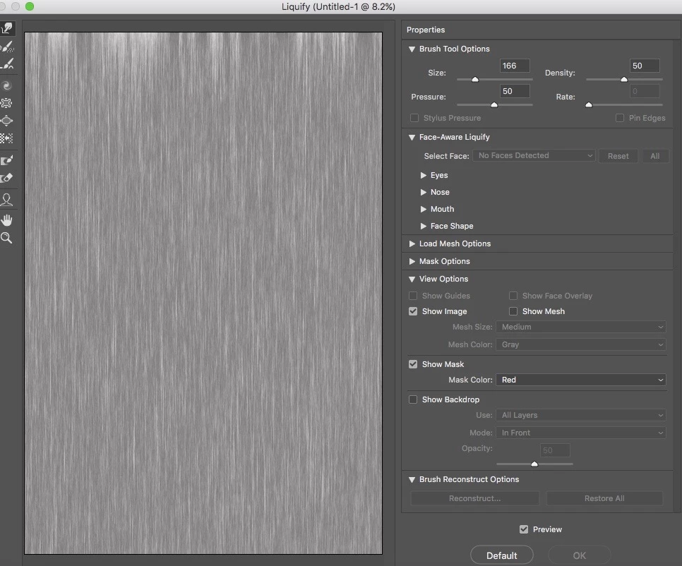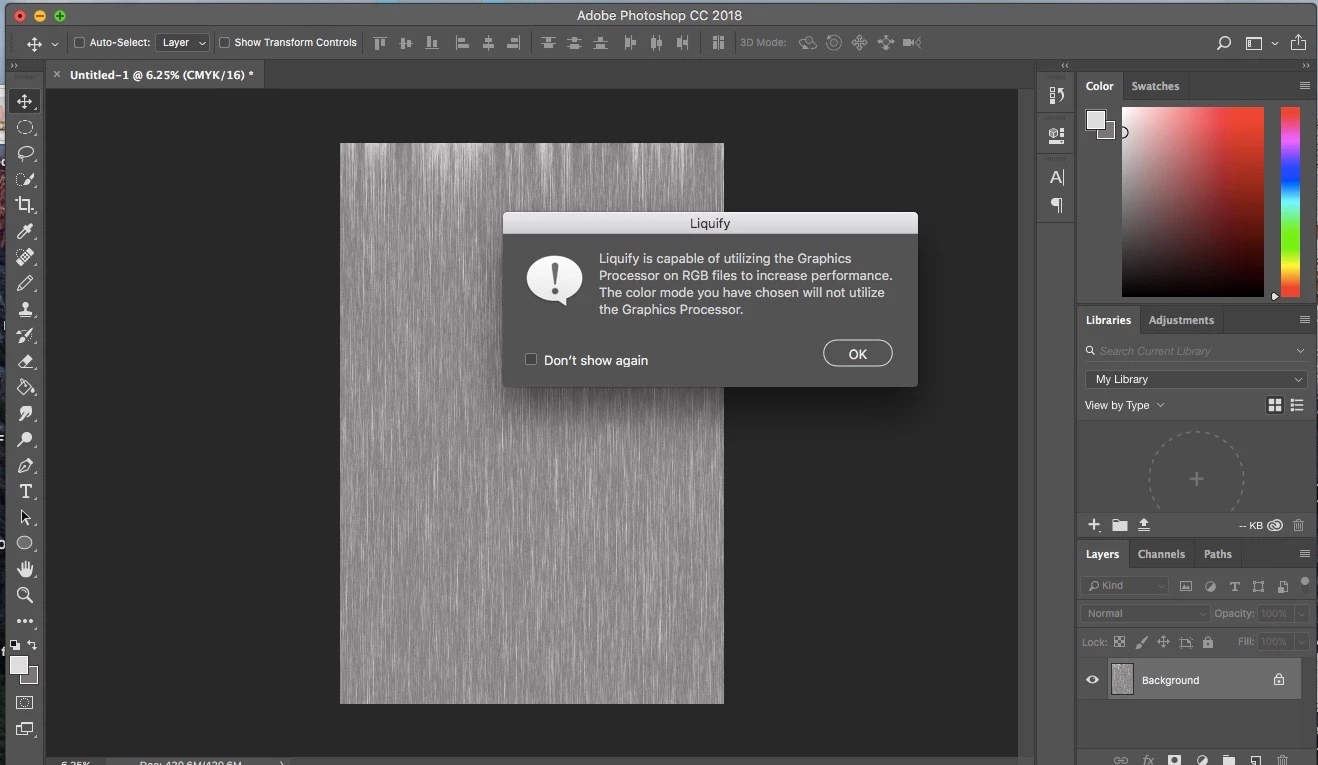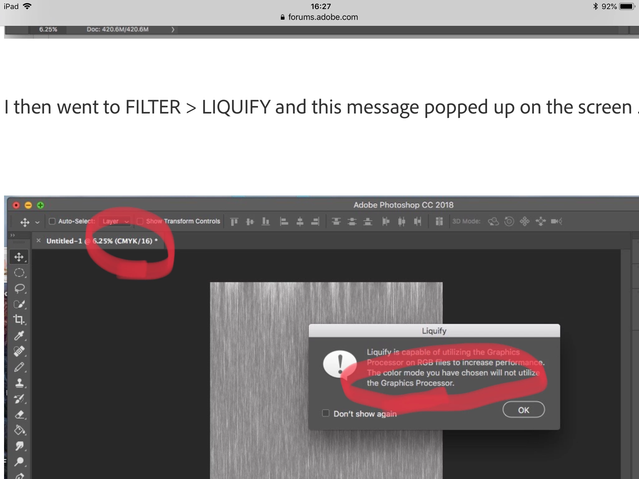 I then went to FILTER > LIQUIFY and this message popped up on the screen ....
