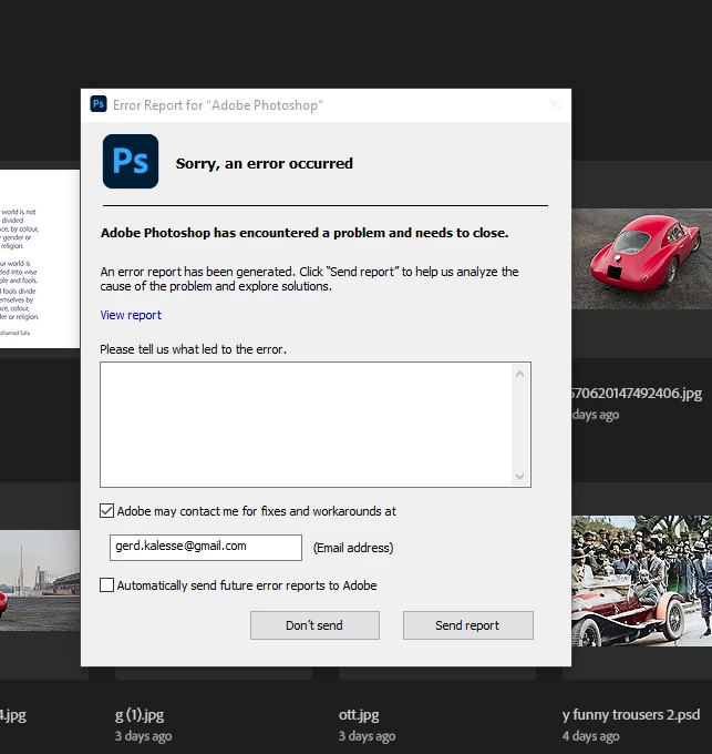When opening Photoshop again, without me doing anything else at all, that ominous message come up very quickly again. Then, it doesn't matter whether I select Submit or Don't submit, Photoshop crashes again and again. It has become unusable.