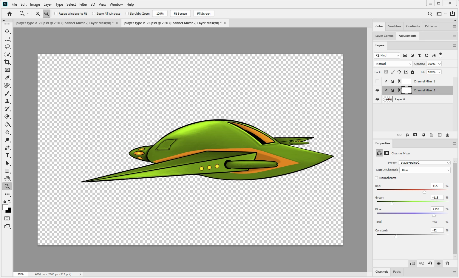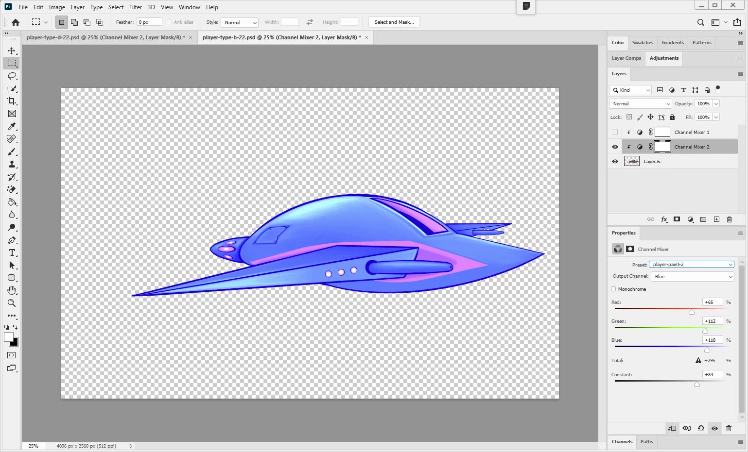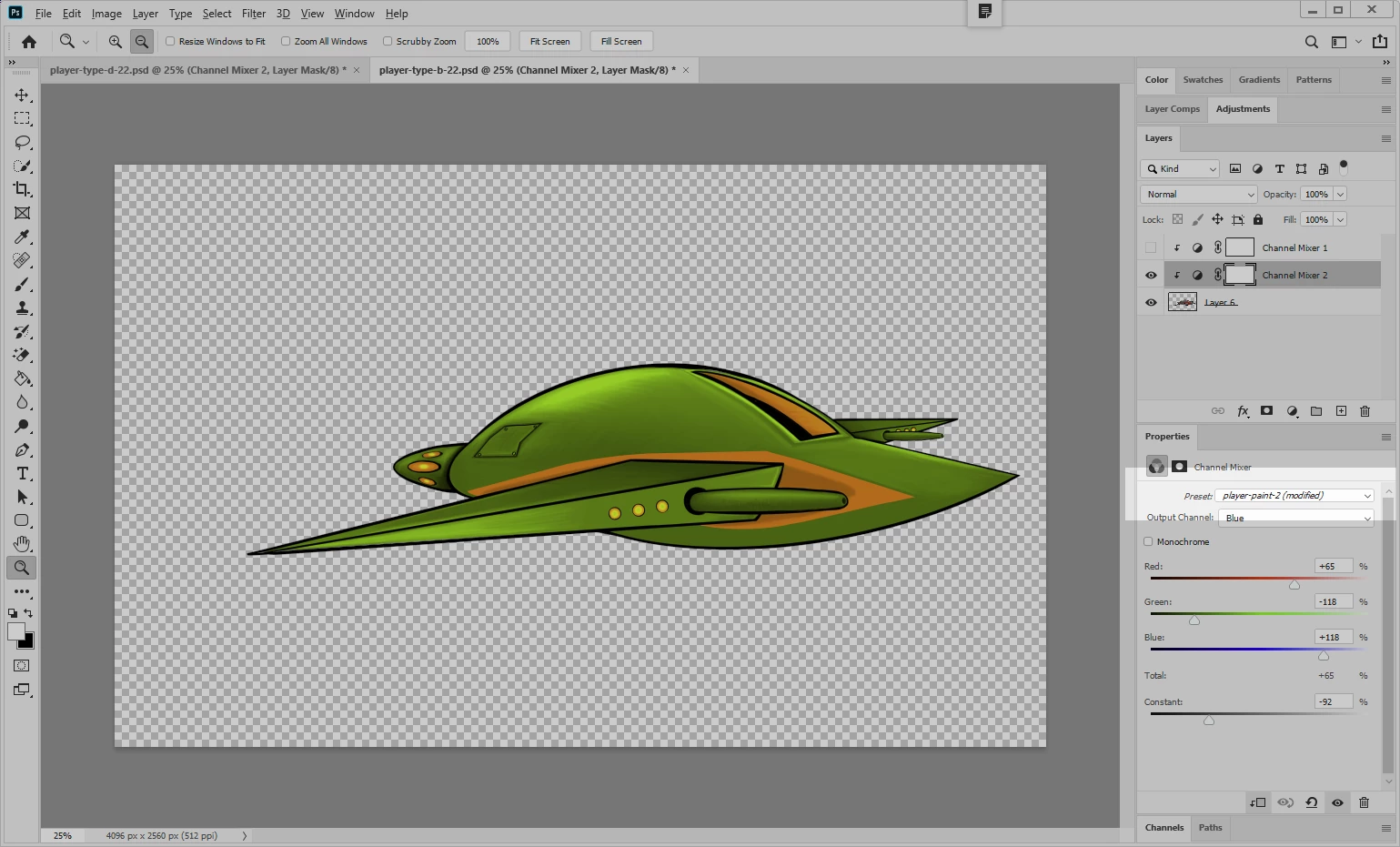 Step 1: Photoshop file with a channel mixer adjustment layer that uses a channel mixer preset file named "player-paint-2"