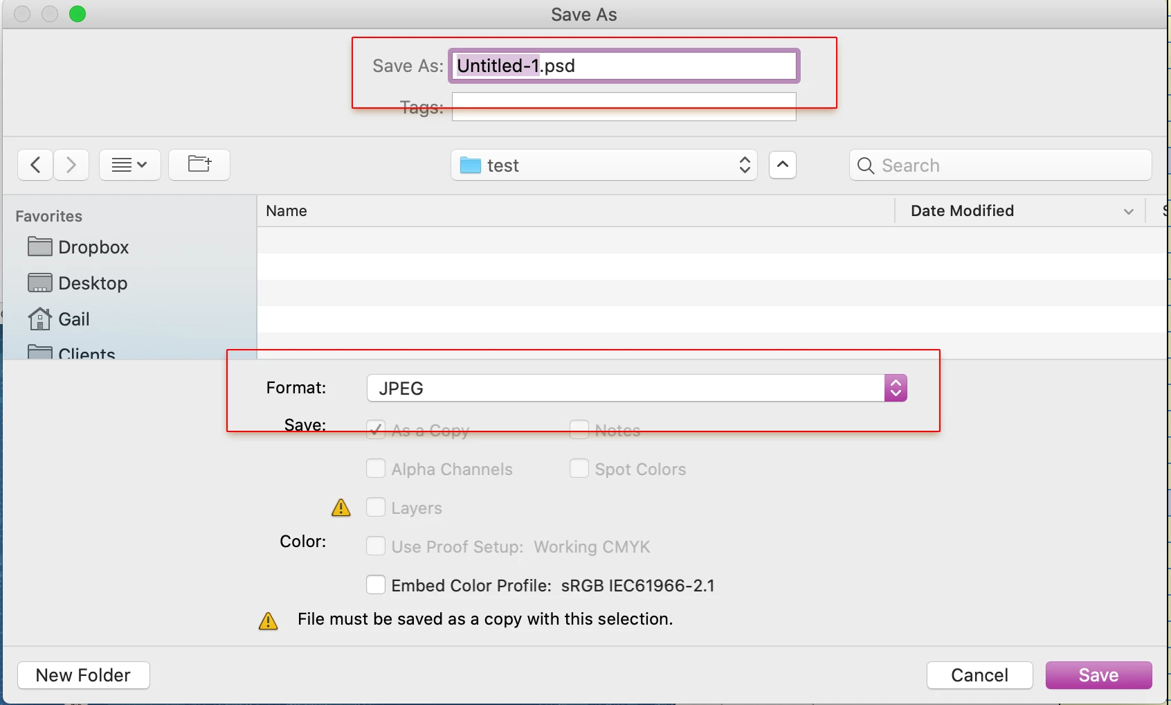 With my Photoshop file open, I go to FILE, SAVE AS, tick AS A COPY, choose format .jpg