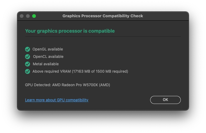 I am runing photoshop on a 2019 Mac Pro with a W5700x. Photoshops built in GPU compatability test gives me ticks on all points.