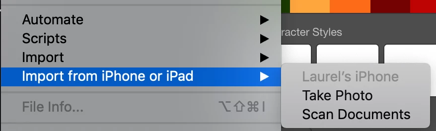 MacOS Photoshop 2020 - File -> "Import from iPhone or iPad"