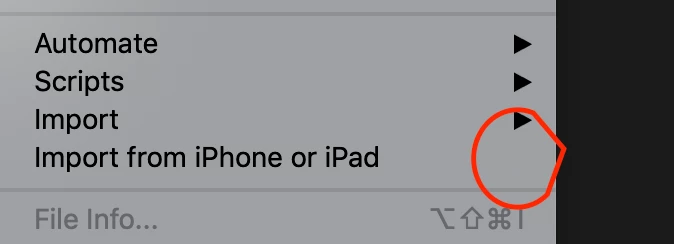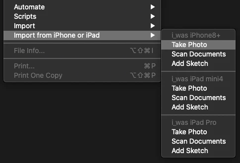 Import from iPhone or iPad is a feature of macOS/iOS Continuity feature set, so for Import from iPhone or iPad to work, your Mac and iOS devices must meet the requirements for Continuity Camera. What are those requirements? They’re in the Apple document linked below: