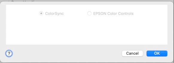 In Photoshop's print process, I prefer to use Photoshop Manages Color and select the ICC profile myself - meaning that, now, I just need to go to the Print Settings (which opens the Epson or Canon etc. print driver), and, there, under Printer Options/Print Settings I select the media type and also check that in the Color Matching section the options are greyed out - with Colorsync selected [here, as below, the options should be greyed, because selecting Photoshop Manages Color tells the driver to disable color management].