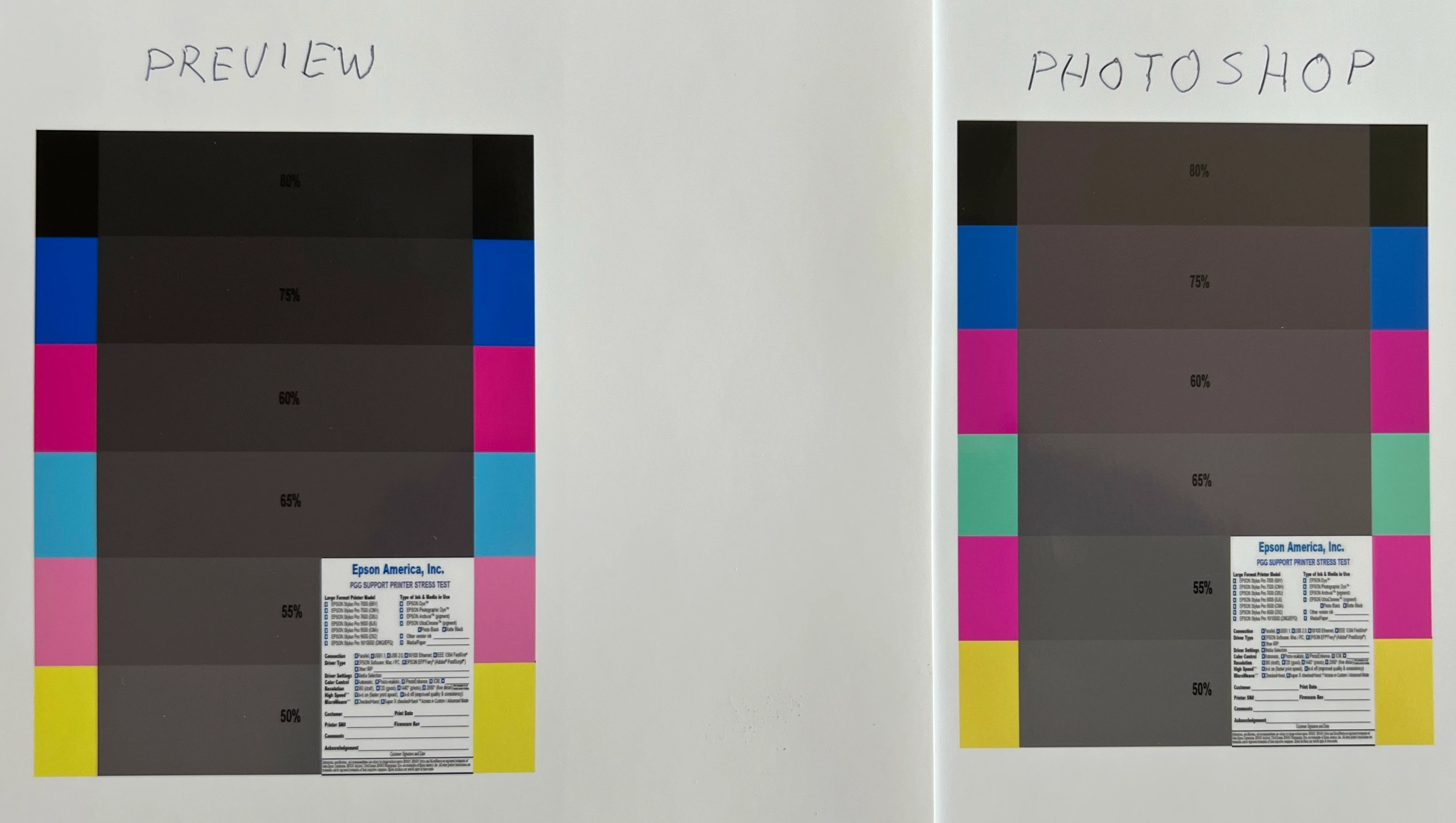 I've been back-and-forth with Epson support about this . They had me make a print of a test image they supplied with Photoshop and also another app. I used Preview. Here are the results, side-by-side: