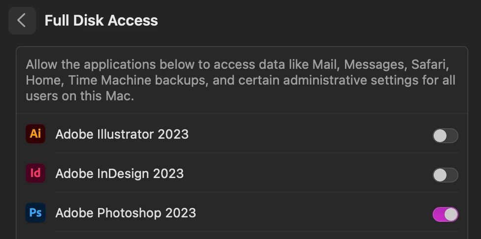 ❌ @adobecare on twitter sent me this link https://adobe.ly/3Q2wuI9 and though ventura's control panel is organized differently now i think i gave PS all the permissions and the issue is still happening