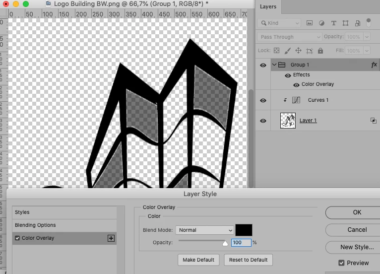 • apply Layer Style Color Overlay to Group containg the two Layers
