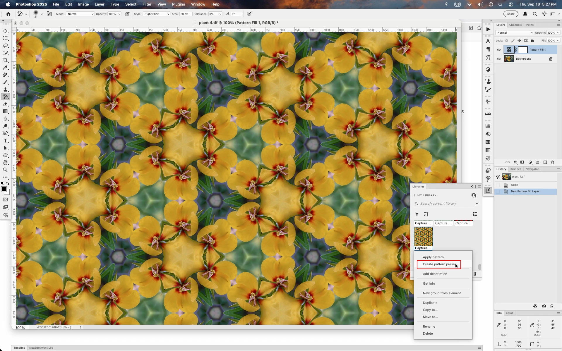 I'm trying to create a pattern from an image in photoshop, and I have a file with one layer (the image). When I Click the plus sign (+) in the Libraries panel in photoshop and select Create from Image, the Define Pattern dialogue box doesn't show. I've made 100's of patterns, and now the Define Pattern dialogue box no longer shows, to create more patterns. How do I fix?