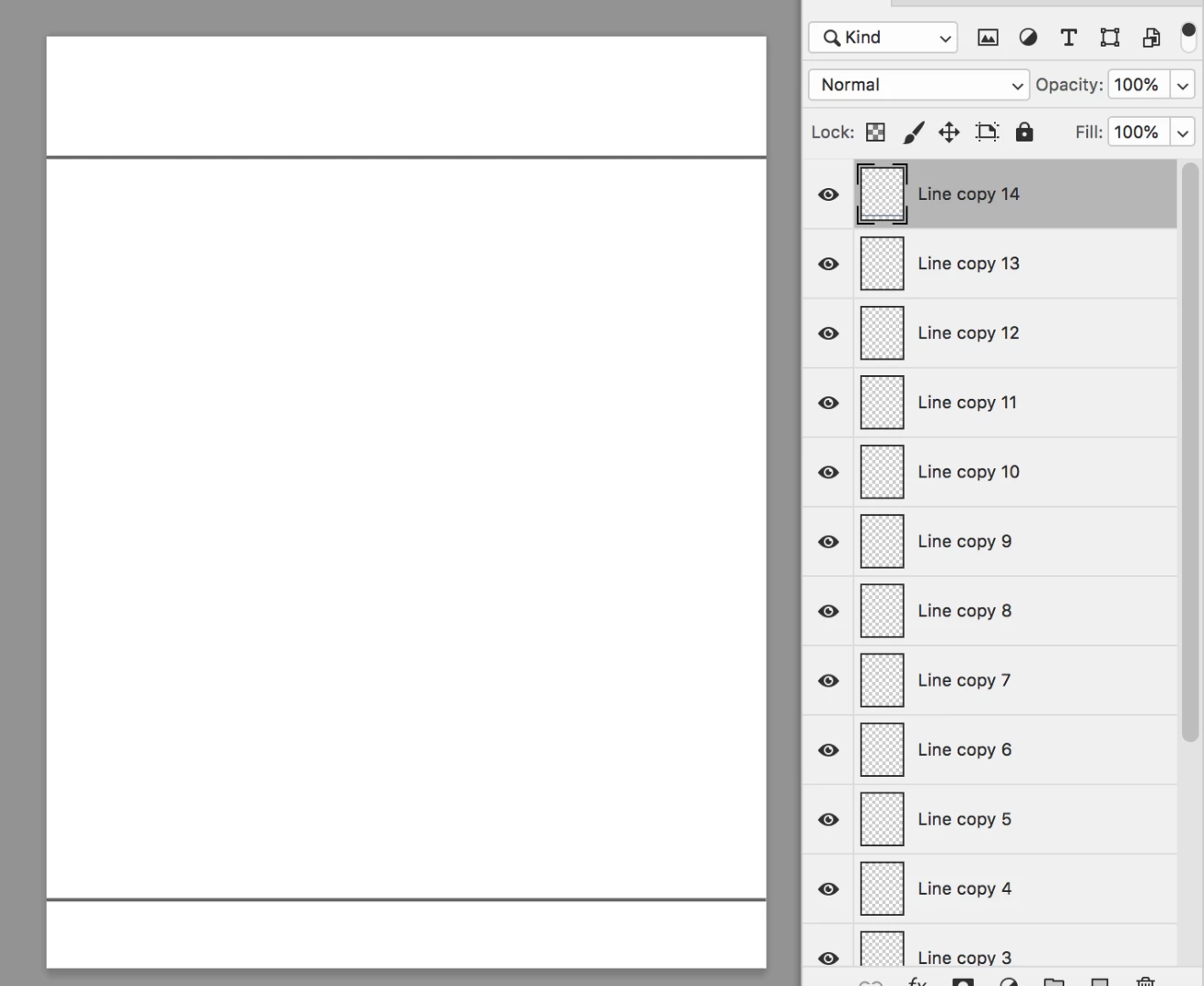 I am new to photoshop and want to make lined paper. (evenly spaced lines) I open a new doc- then make a new layer. First I make an even line with the line tool. Then I Control J to make several copies. I select the last layer and control T to transform. When I left click to drag on line to bring it down to the bottom so I can redistribute lines after- it just makes a huge filled in rectangle shape. Even when I skip the copies and just try to free transform the line to make an exact copy it makes a filled in rectangle shape. I hope this question makes sense.Thanks for any help.