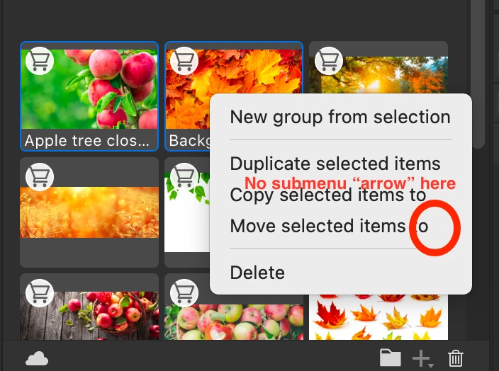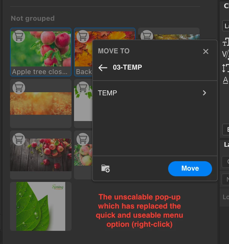Library panel in PS has never been super useable, but for moving and copying assets between CC libraries it was the easiest option amongst all the options. It WAS possible to select multiple assets (for example Adobe tock photos) and organize them in to different libraries and groups with a single click. The hierarchial menu showing ALL the destination locations (libraries and groups) was not as intuitive as possible but it was FAST and it WORKED.