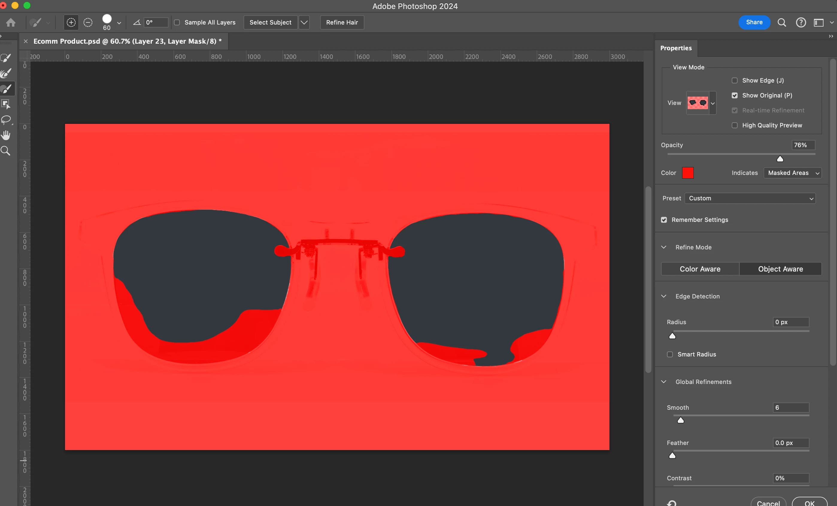In "Select and Mask" I can't add or subtract from the mask. Everything was working perfect until yesterday, and then it started glitching.