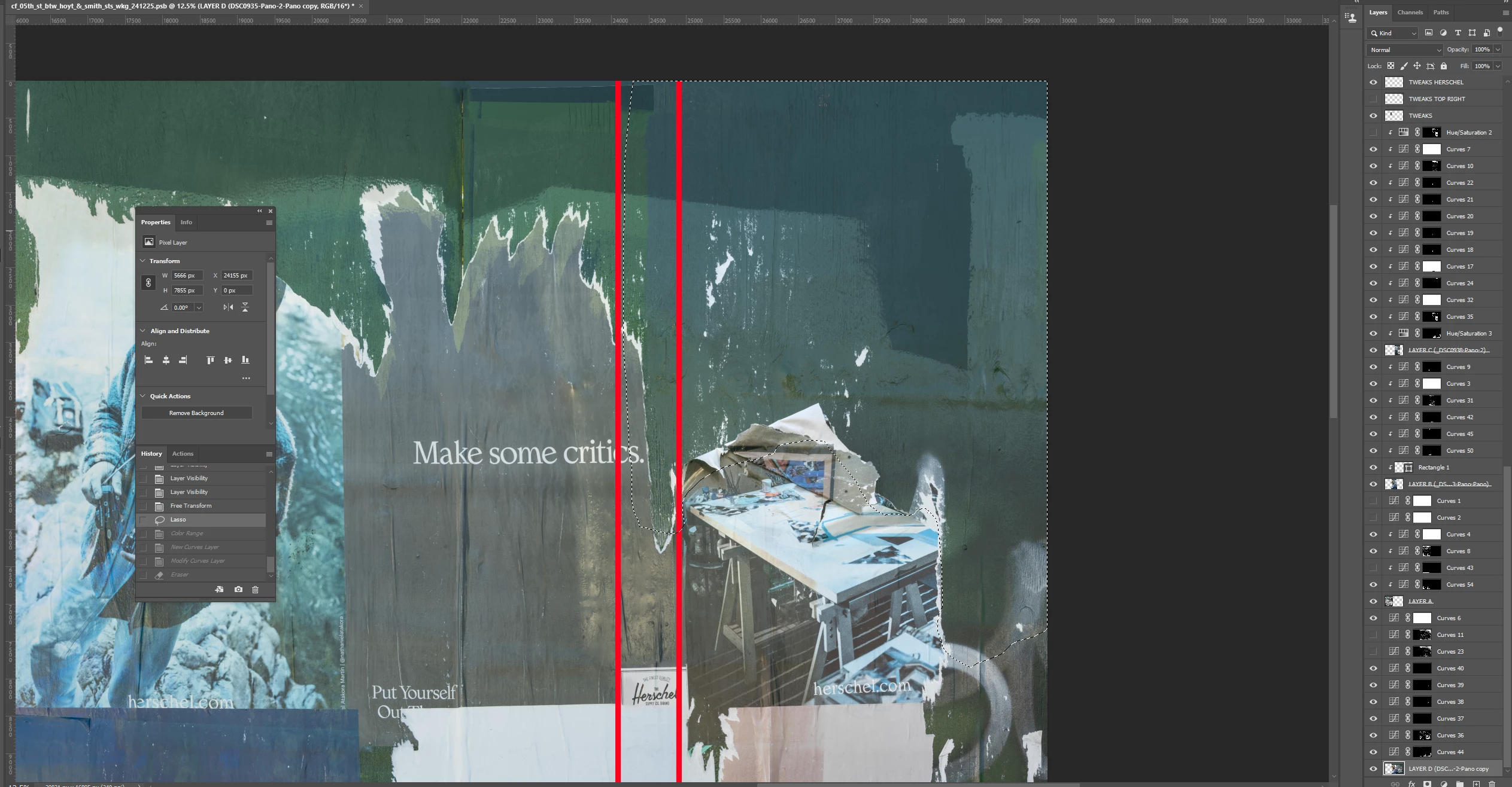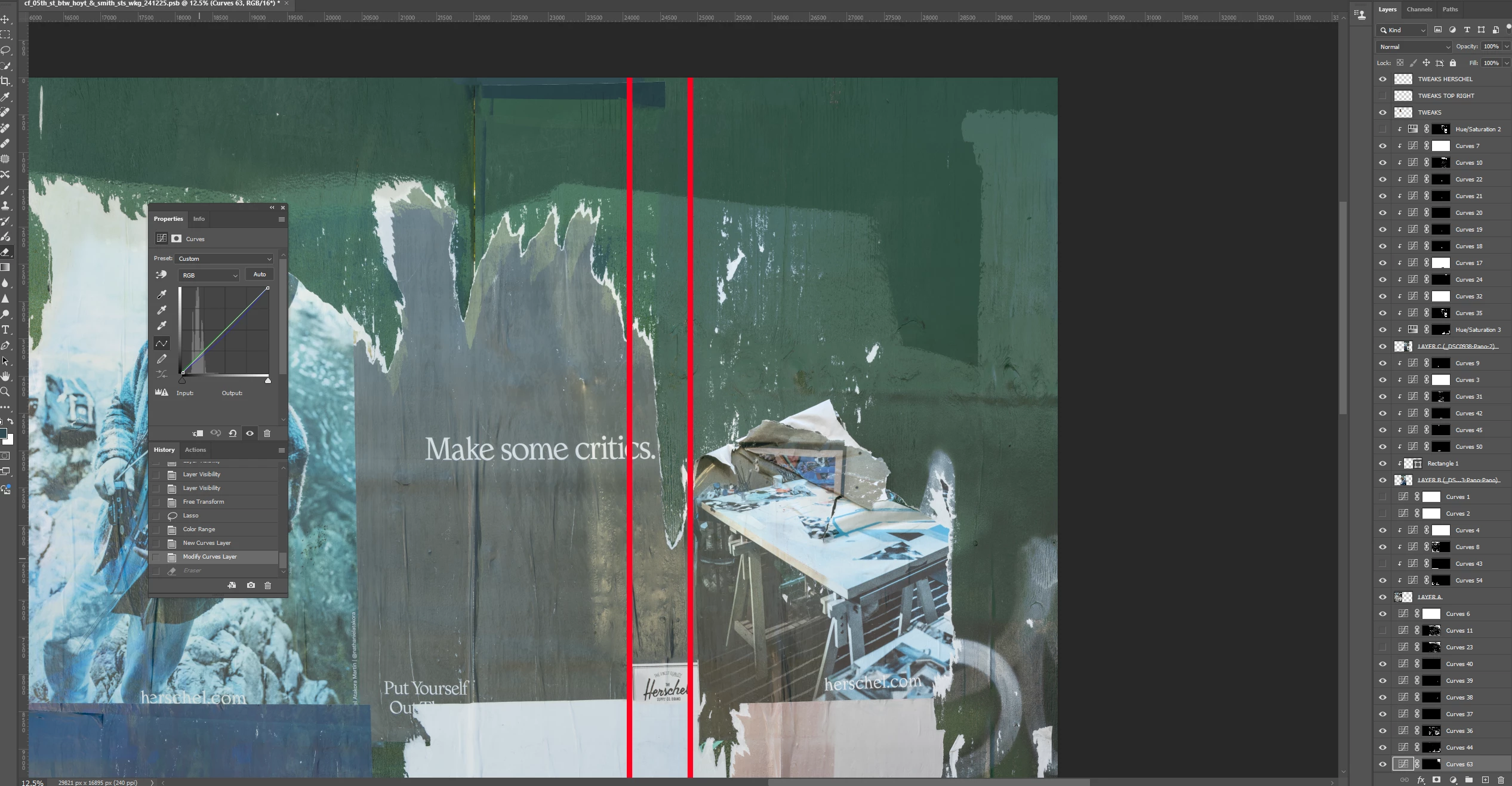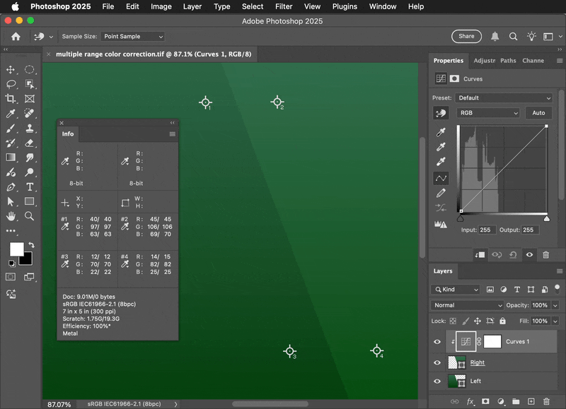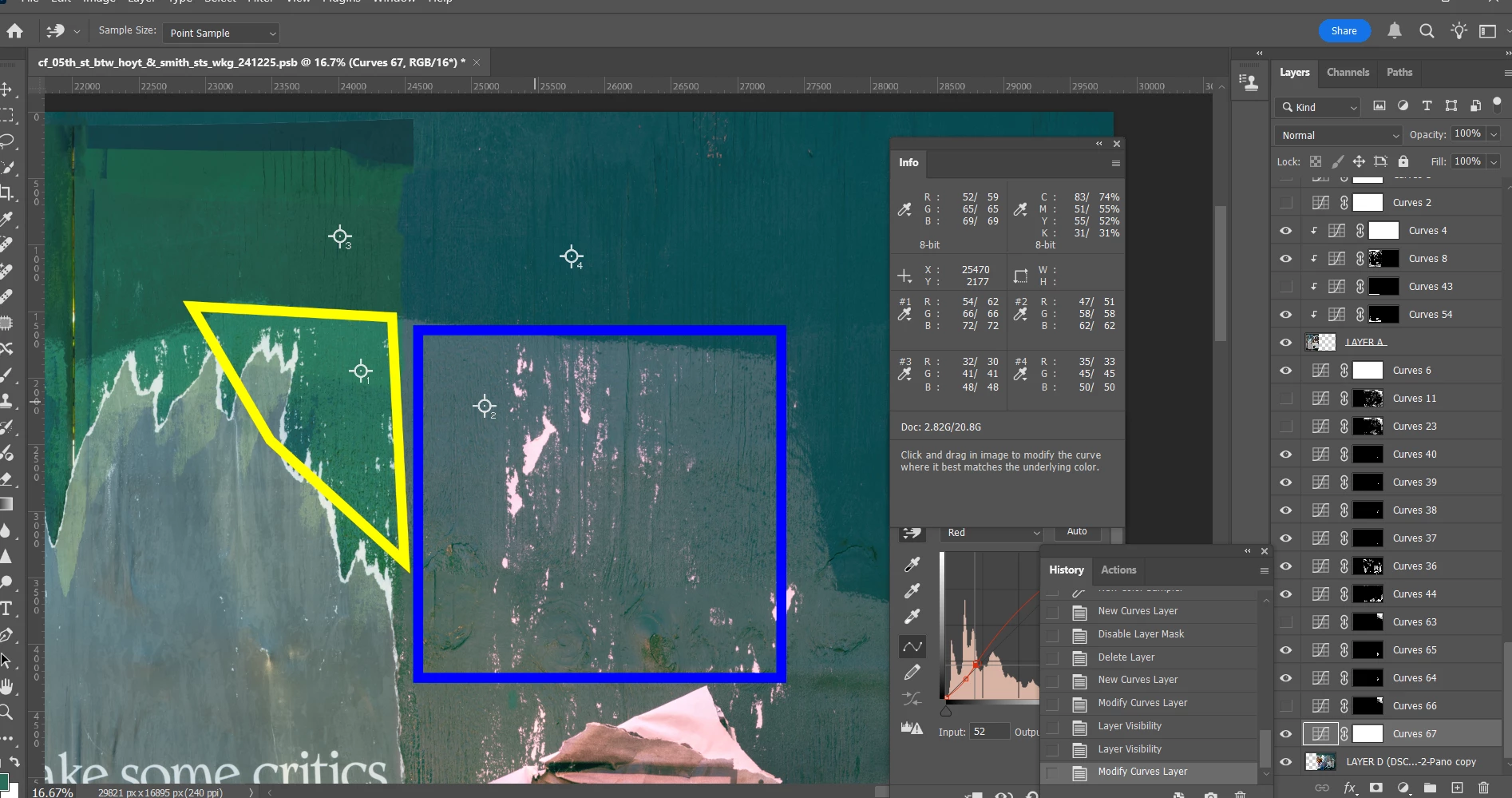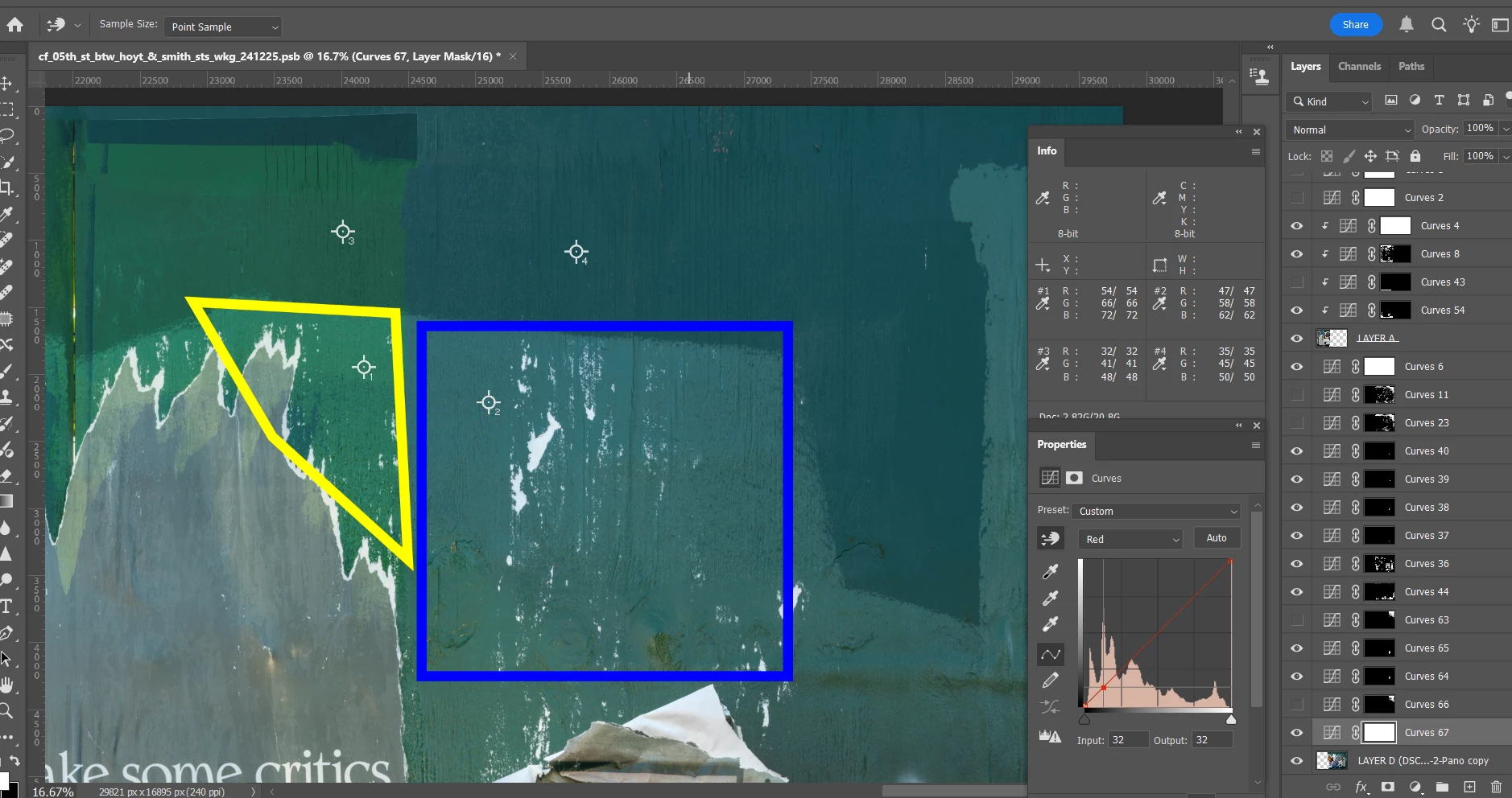 I wonder if anyone has suggestions on the following. I needed to match the greens in the upper part of LAYER D (rightmost layer) to LAYER C adjoining it to the left. I lassoed the area and used Color Range to select the darker green and match it to the left using a Curves Layer. The red rectangle surrounds the seam dividing the 2 Layers. But the lighter green underneath the darker green was also selected in the Color Range selection and now these areas in LAYERS C & D (divided by the seam in the blue rectangle, screenshot 3) don't match. Is there a tool or technique that would enable me to match these areas by, preferably, matching the color in the area of LAYER C defined approximately by the blue rectangle in screenshot 4? I don't think Color Range will work for the same reason that it didn't distinguish between the 2 different greens in the other instance. Many thanks.