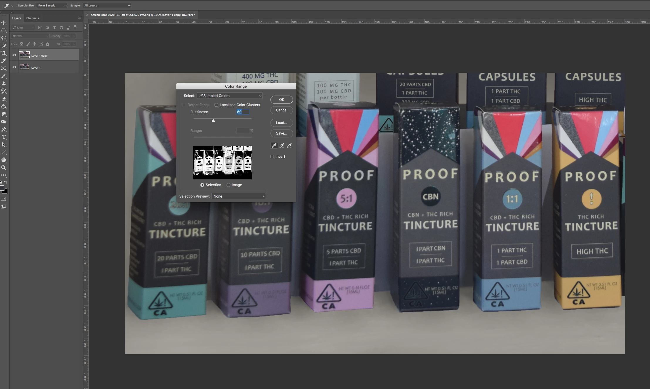 I'm trying to make all of the grey areas on these boxes look like the same shade. Unforunately, our packaging comes out with different grey tones for these grey areas, even though the file I provide to the printer has consistent grey tones. Anyway, what's the best way to adjust these grey areas? The three boxes on the right look fine, but I'd especially like to change the grey area on the pink box, since it's the darkest and most distracting. I've used the color replacement tool and it doesn't really make a difference. Masking is difficult because of the text on the box, but I will do that if necessary... I'd have to use the pen tool because quick selection tool doesn't grab around the text correctly.