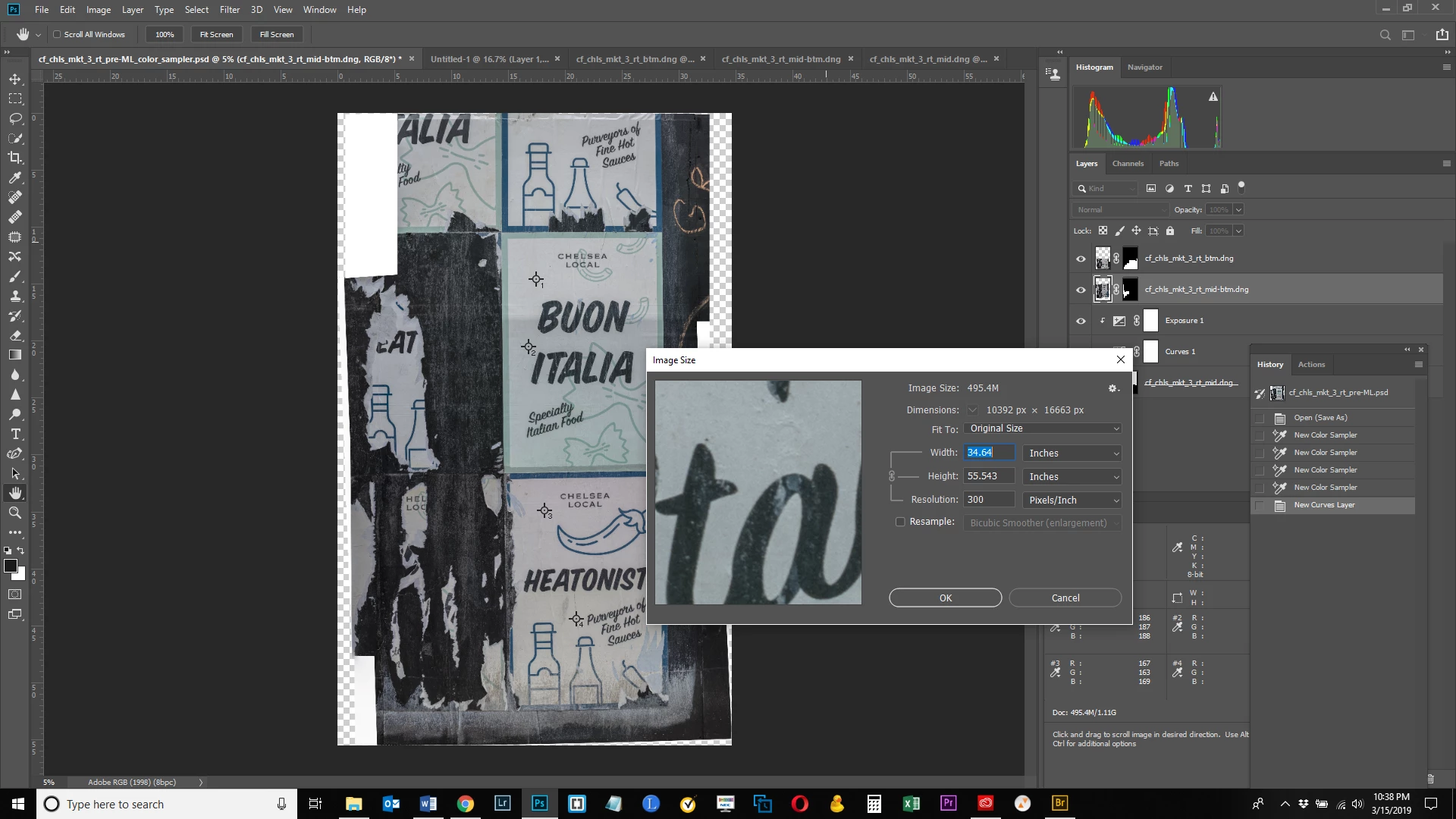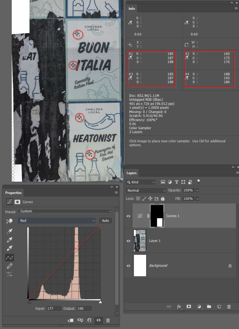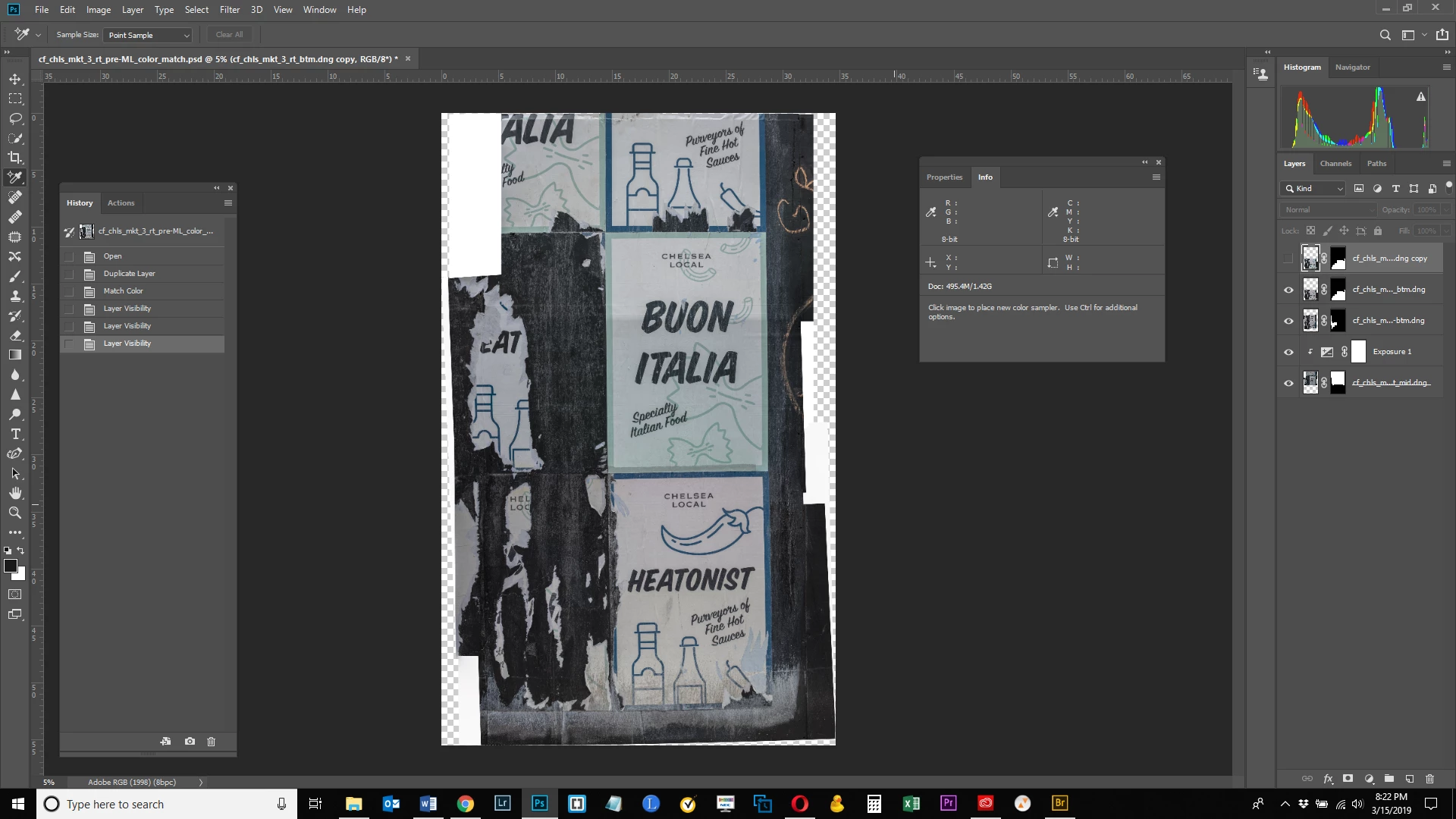 I need to learn how to blend and match colors in an image. In the below screen shot, I tiled several raw files together to create a single image which will be assembled into a still larger image. For now, I want to make the color cast of the 2 bottom posters match. The upper poster has a green cast that I want to alter to match the more neutral, slightly warmer cast of the poster below it. I tried adding a Hue/Saturation adjustment layer but that did not work well. Does anyone have suggestions on how to achieve this goal? Thank you.