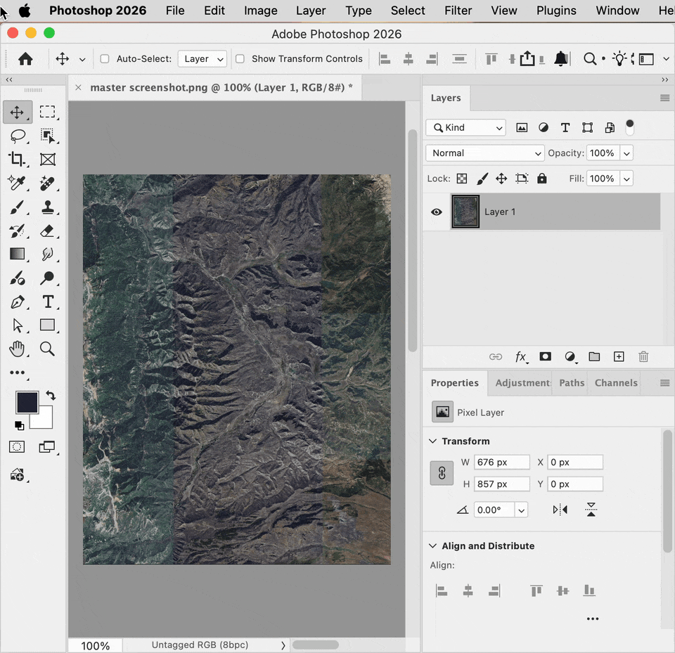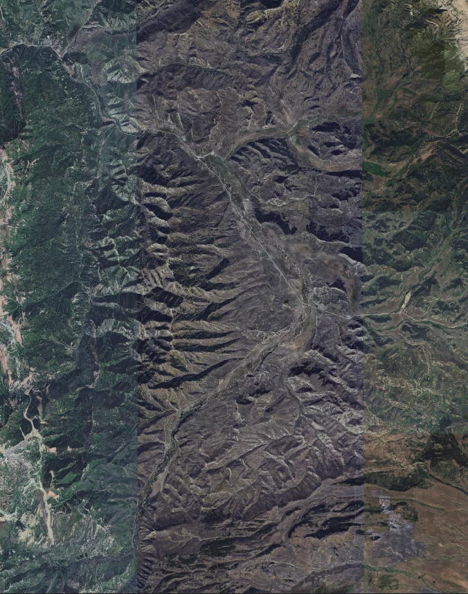 I am attempting to make a map of an area for a gift. I stitched together 60 tiles from google earth. On photoshop you can clearly see the differences in the shading/color that appear in straight vertical lines (see attached). Does anyone have any advice on how to best blend this together so that it looks more uniform?