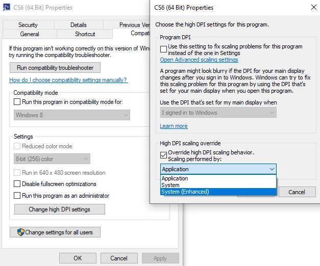 I have tried opening the Properties for Photoshop.exe and working with the compatability settings but nothing changes.  This has been and issue for at least 4 years and it is very disappointing that this has not been fixed yet.  How can I fix this in Photoshop and Bridge?