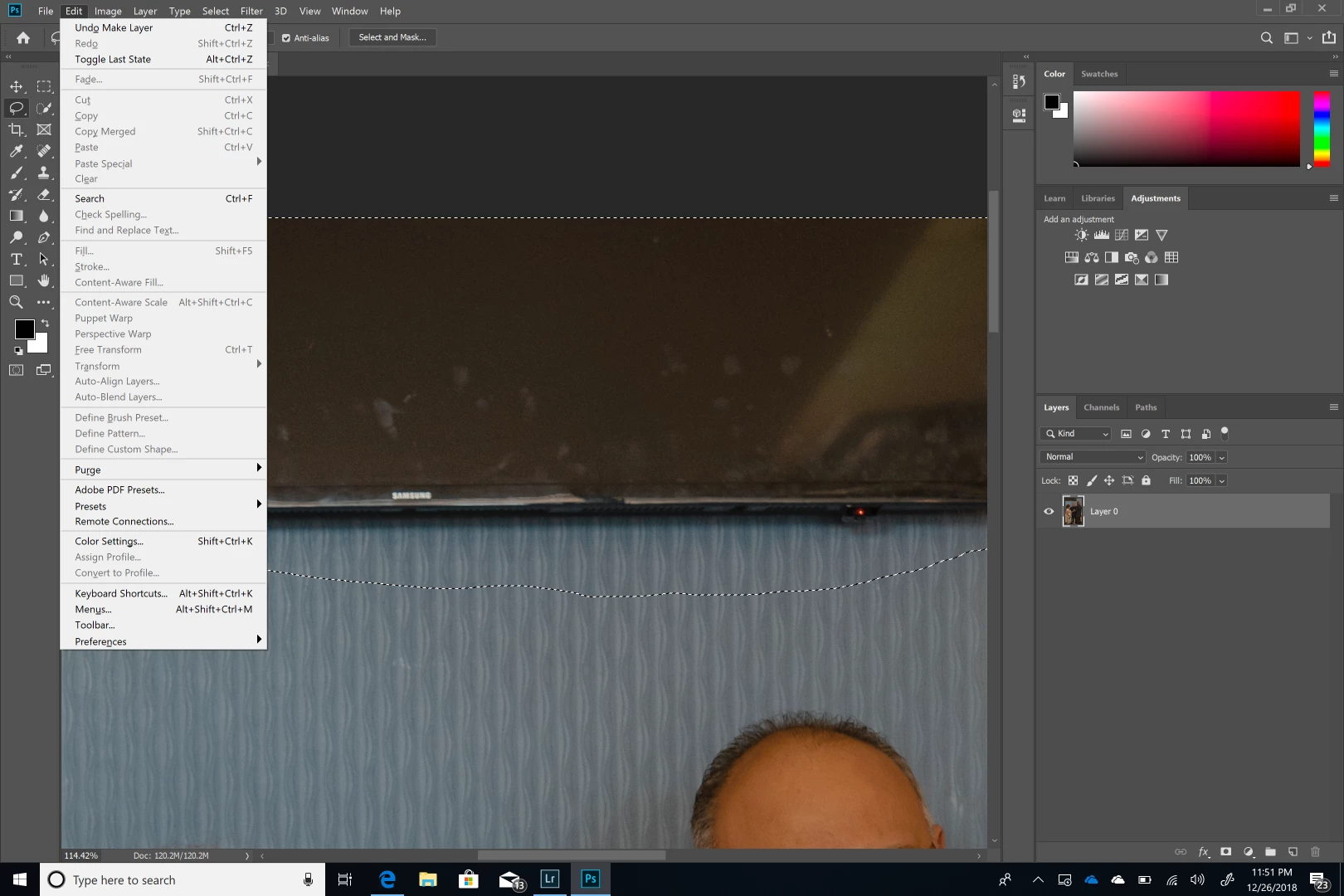 I have imported a file from Lightroom to Photoshop using the edit in Photoshop 2019 option, to remove some items using the content aware fill feature. the problem I'm now having is that the features in the menu are all greyed out. I have reset the program options in the preferences menu. I have started the processes again from scratch and still having the same results after restarting the computer. The lasso tool is what I'm using to select the object. Additionally almost all of the menus are exhibiting the same issue. Below is a screenshot of the issue.