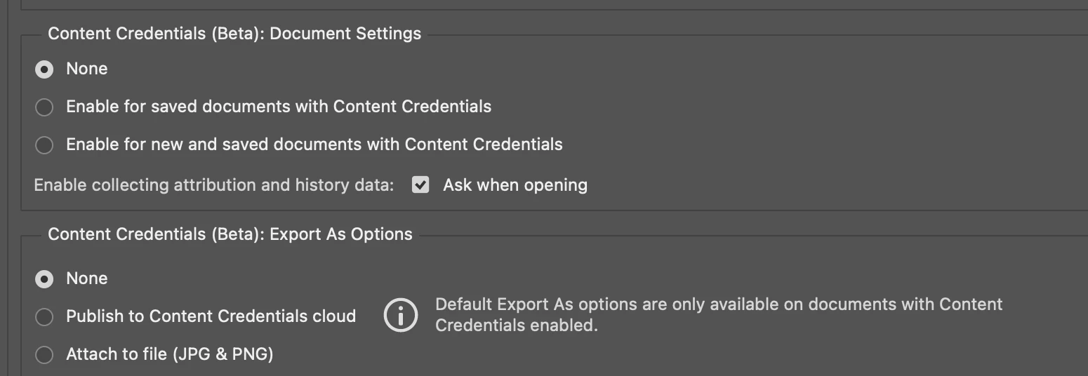 So, apparently Adobe has begun adding metadata to images that says they were made with AI (or at the very least, that AI was used) if you used Gen Fill at all. I realized this because some websites, such as Instagram, have begun automatically labeling any images I had used Gen Fill on as "Made with AI" based on the metadata Photoshop had added, without the option for me to remove the label.