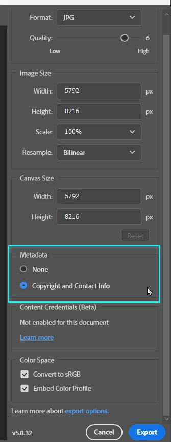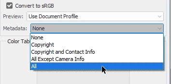 I open a raw data file (with Metadata) with photoshop. I want to covert it to a JPG file. I use "Export as" and select JPG. When I export the file the Metadata is no longer with the converted file. I have set the options in the export section to include metadata. I move the file from a Camera disk into photoshop then to my local documents folder on a windows PC. Any help on what I am doing wrong is appreciated. I can not be the only person who needs to do this. Thanks in advance.