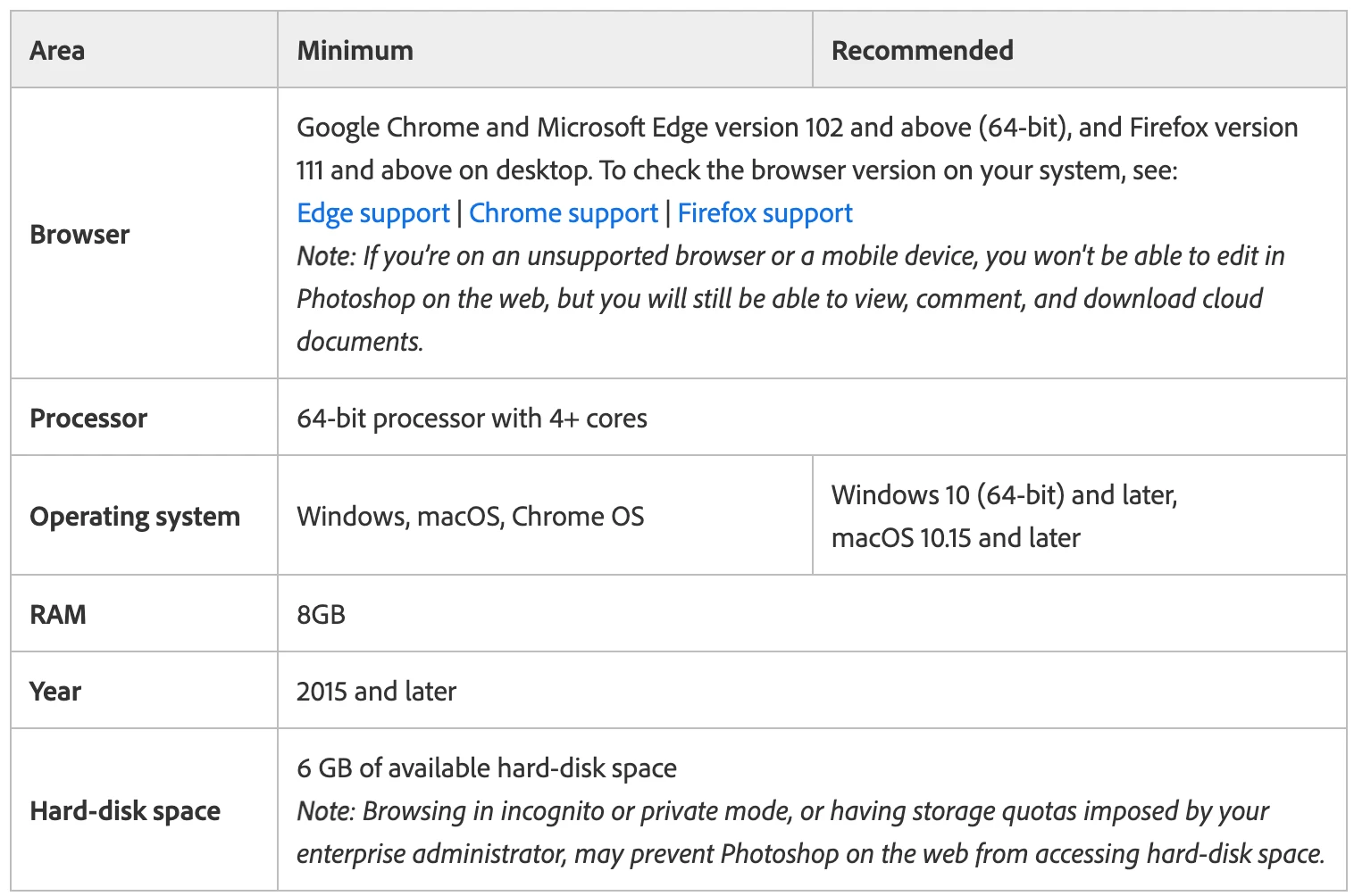 Minimum requirements for Photoshop on the web? [2019 Mac Pro, Ventura — can someone test please?]