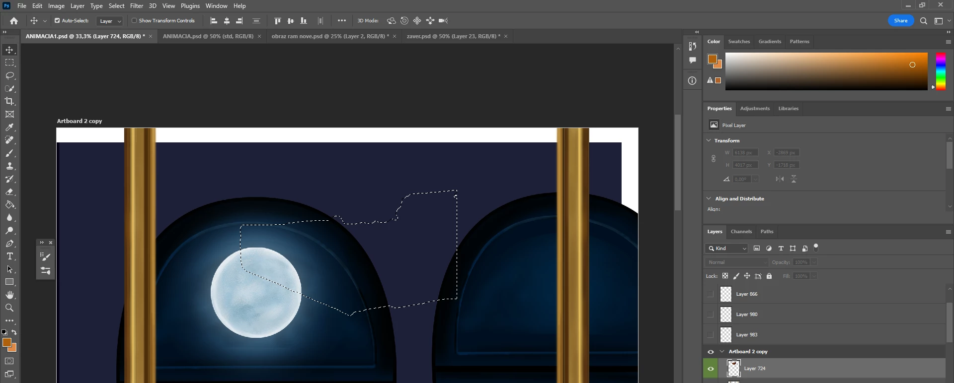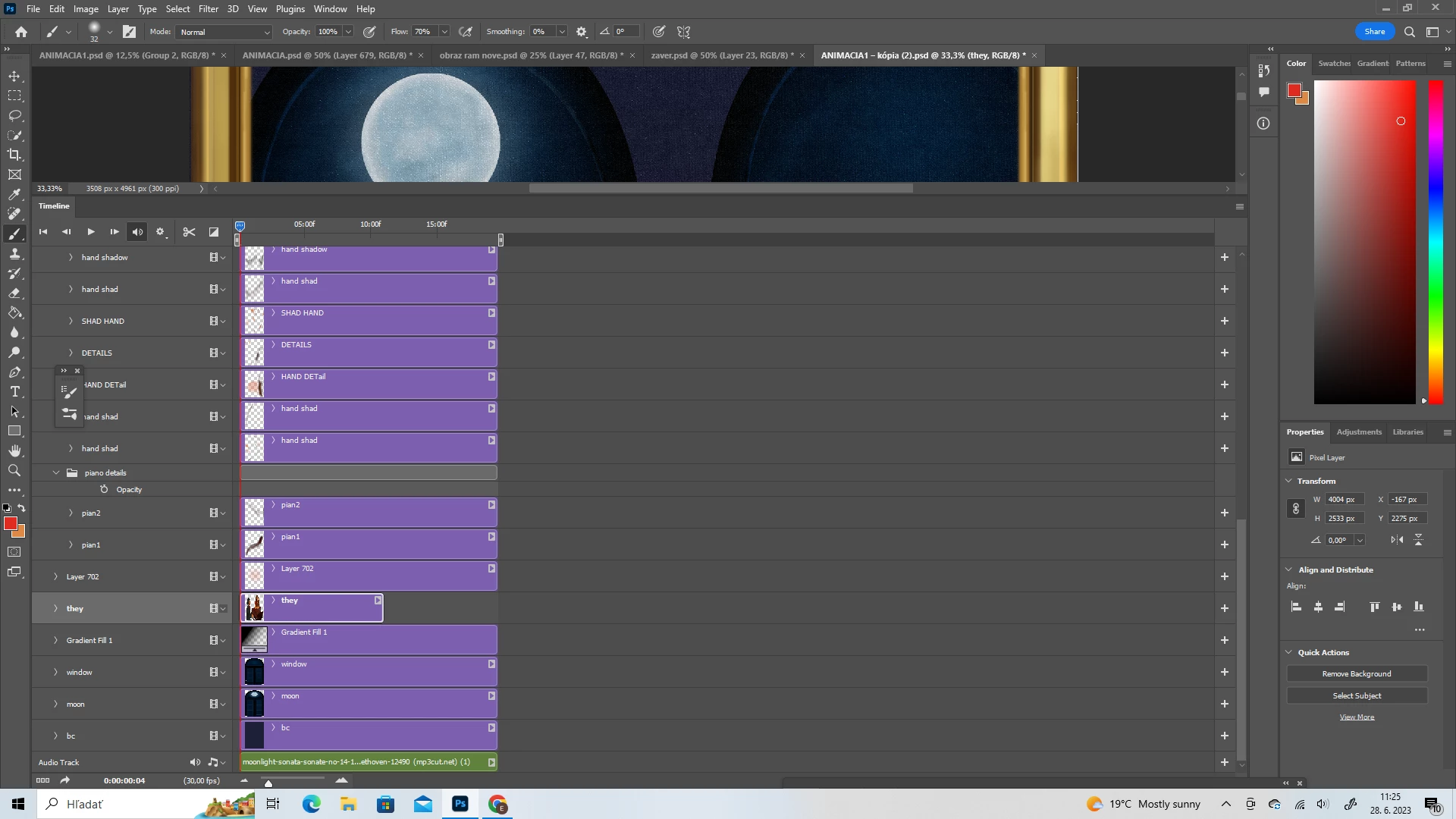 I struggled for a long time, but I discovered why this issue happened. It is a quite silly fault. I was preparing this art for an animation. All layers were separated in the timeline. I worked with a few of them, others I did not change because the video should be short, but later I made the video longer, and the majority of them I made longer. I forgot that all new layers should be made longer too. It is a first time when I do an animation. 🙂